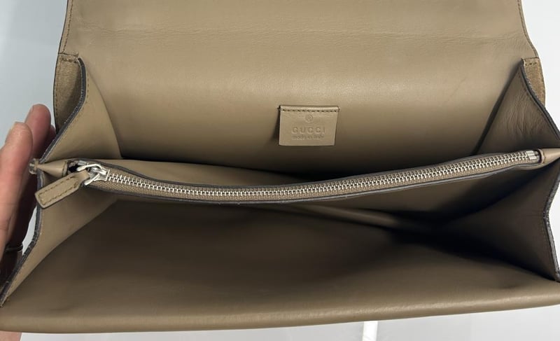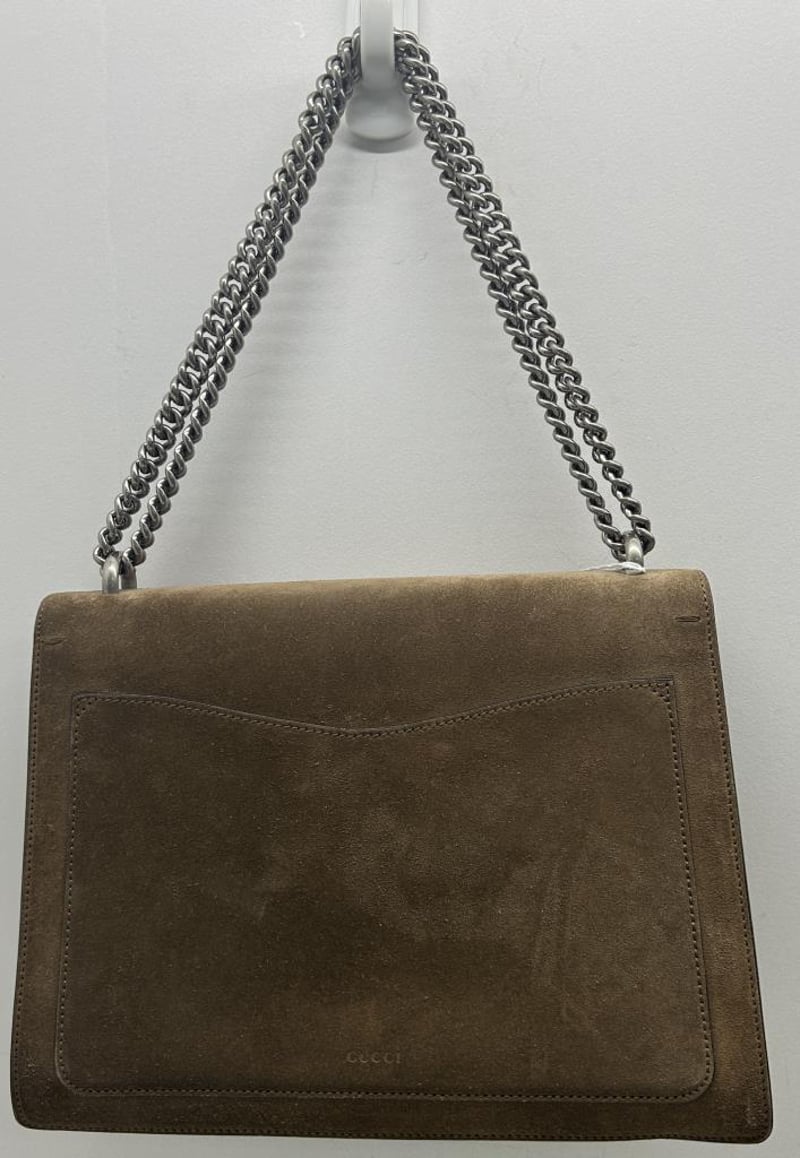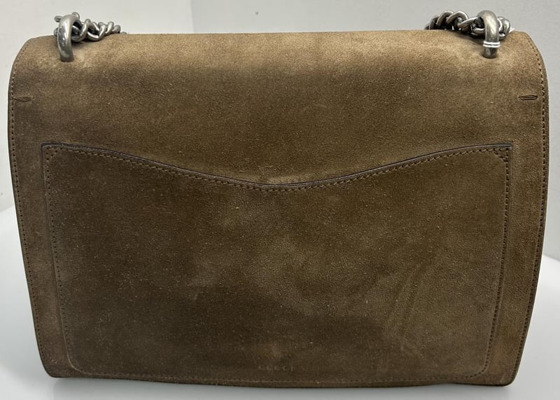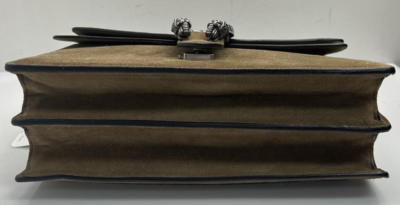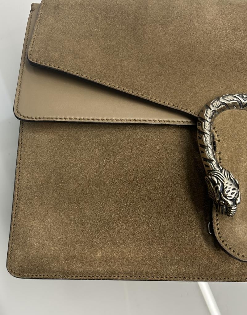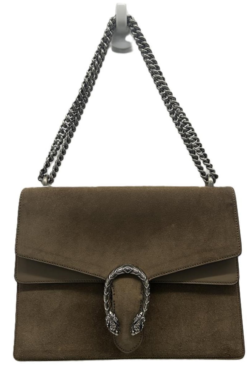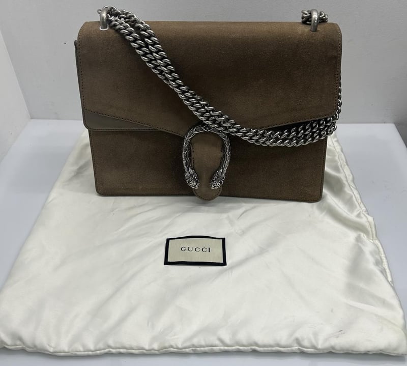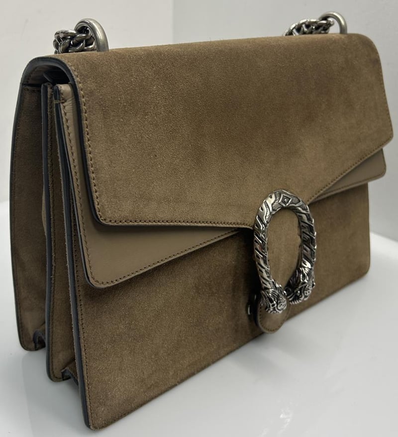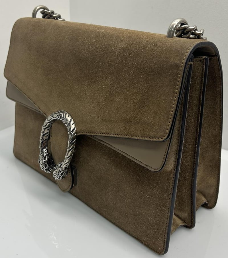 GUCCI DIONYSUS TAUPE SUEDE LEATHER SHOULDER BAG, SILVER-TONE HARDWARE, SINGLE TOP FLAT HANDLE, CHAIN SHOULDER STRAP, FRONT FLAP WITH TEXTURED DOUBLE TIGER HEAD CLOSURE, BACK SLIP POCKET, TAUPE LEATHER LINING WITH FRONT FLAP POCKET, INCLUDES DUST COVER, BAG MEASURES 30 X 20 X 12 CM, MADE IN ITALY. THIS ITEM HAS BEEN PROFESSIONALLY VERIFIED AS A GENUINE PRODUCT AND COMES WITH ACCOMPANYING 3RD PARTY CERTIFICATE OF AUTHENTICITY, CONDITION 9/10 EXCELLENT PRE-OWNED CONDITION WITH LIGHT SIGNS OF USE.