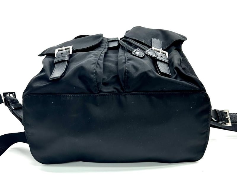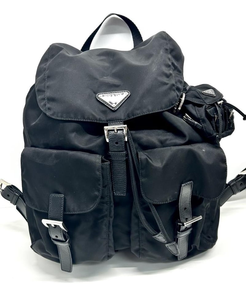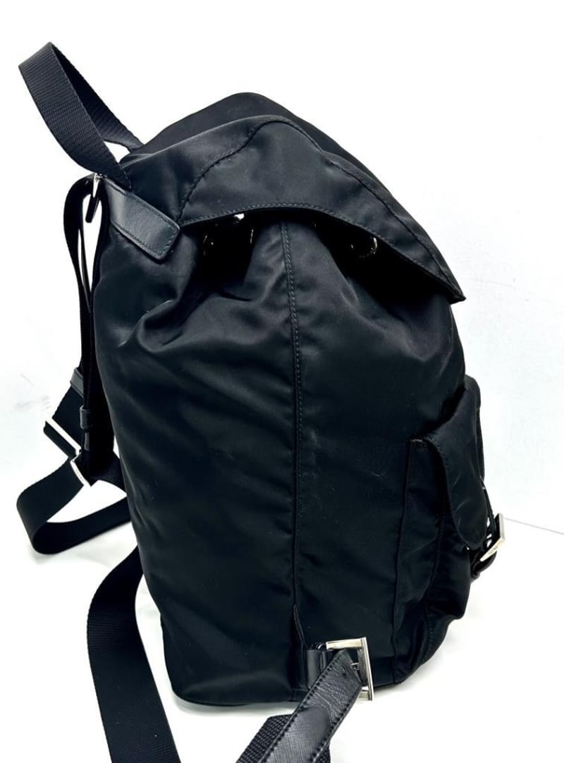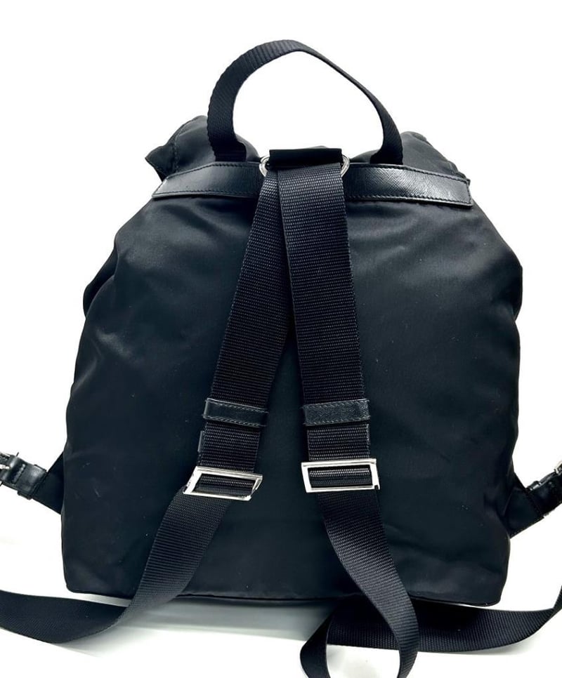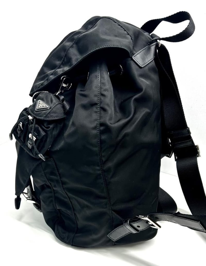 PRADA MILANO RE-NYLON BACKPACK, BLACK NYLON WITH BLACK LEATHER TRIM, 2 FRONT POCKETS WITH BUCKLE CLOSURE, TRIANGLE ENAMEL LOGO PLAQUE ON FLAP, TOP DRAWSTRING & TOP FLAP WITH BUCKLE CLOSURE, SINGLE TOP HANDLE & 2 BACK ADJUSTABLE/REMOVABLE STRAPS, SIGNATURE PRADA NYLON LINING WITH 1 ZIP POCKET, REMOVABLE MINI BACKPACK, BAG MEASURES W30XH30XD15CM, MADE IN ITALY. THIS ITEM HAS BEEN PROFESSIONALLY VERIFIED AS A GENUINE PRODUCT AND COMES WITH ACCOMPANYING 3RD PARTY CERTIFICATE OF AUTHENTICITY