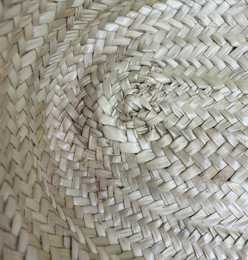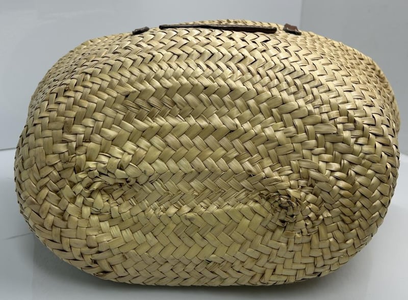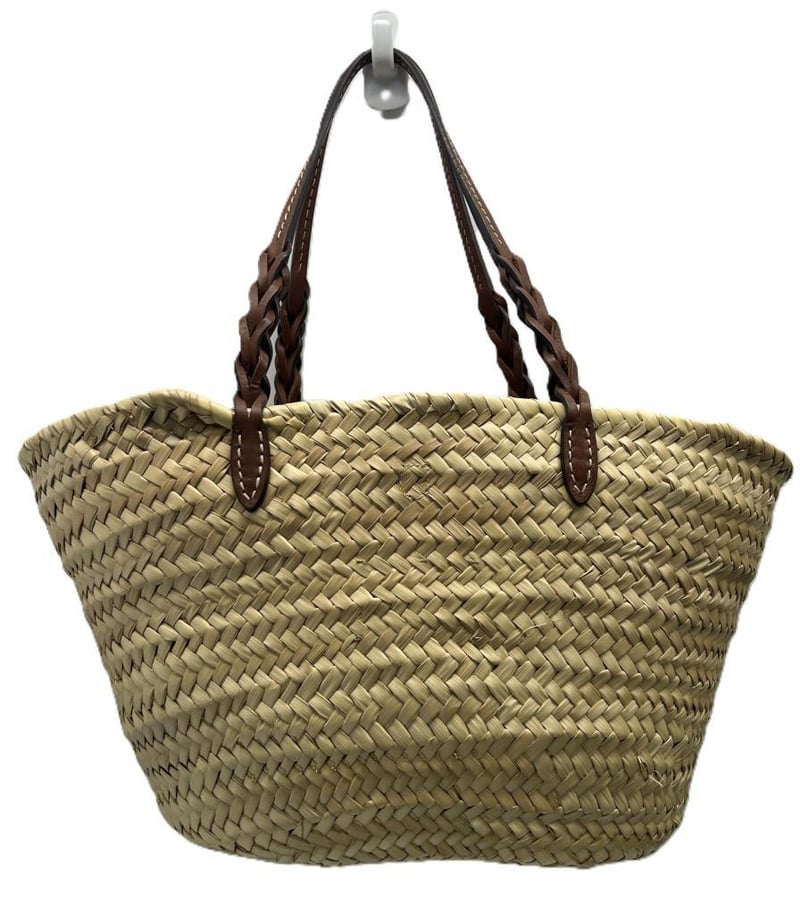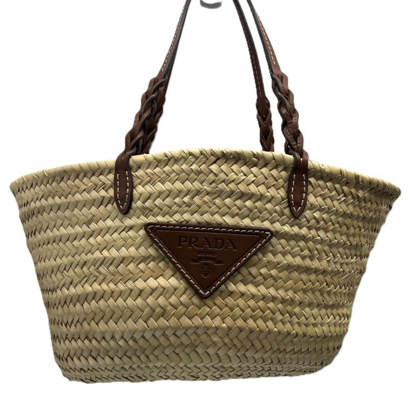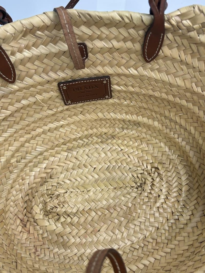 PRADA NATURAL WOVEN BASKET TOTE, FEATURING BROWN LEATHER BRAIDED TOP HANDLES, STITCHED PRADA MILANO TRIANGLE LOGO PLAQUE. UNLINED INTERIOR WITH OPEN TOP DESIGN. MEASURES APPROXIMATELY 28 X 23 X 17CM. MADE IN ITALY. GENTLY USED — MINOR INTERIOR MARKS AND NATURAL VARIATIONS IN RAFFIA WEAVE. THIS ITEM HAS BEEN PROFESSIONALLY VERIFIED AS A GENUINE PRODUCT AND COMES WITH ACCOMPANYING 3RD PARTY CERTIFICATE OF AUTHENTICITY