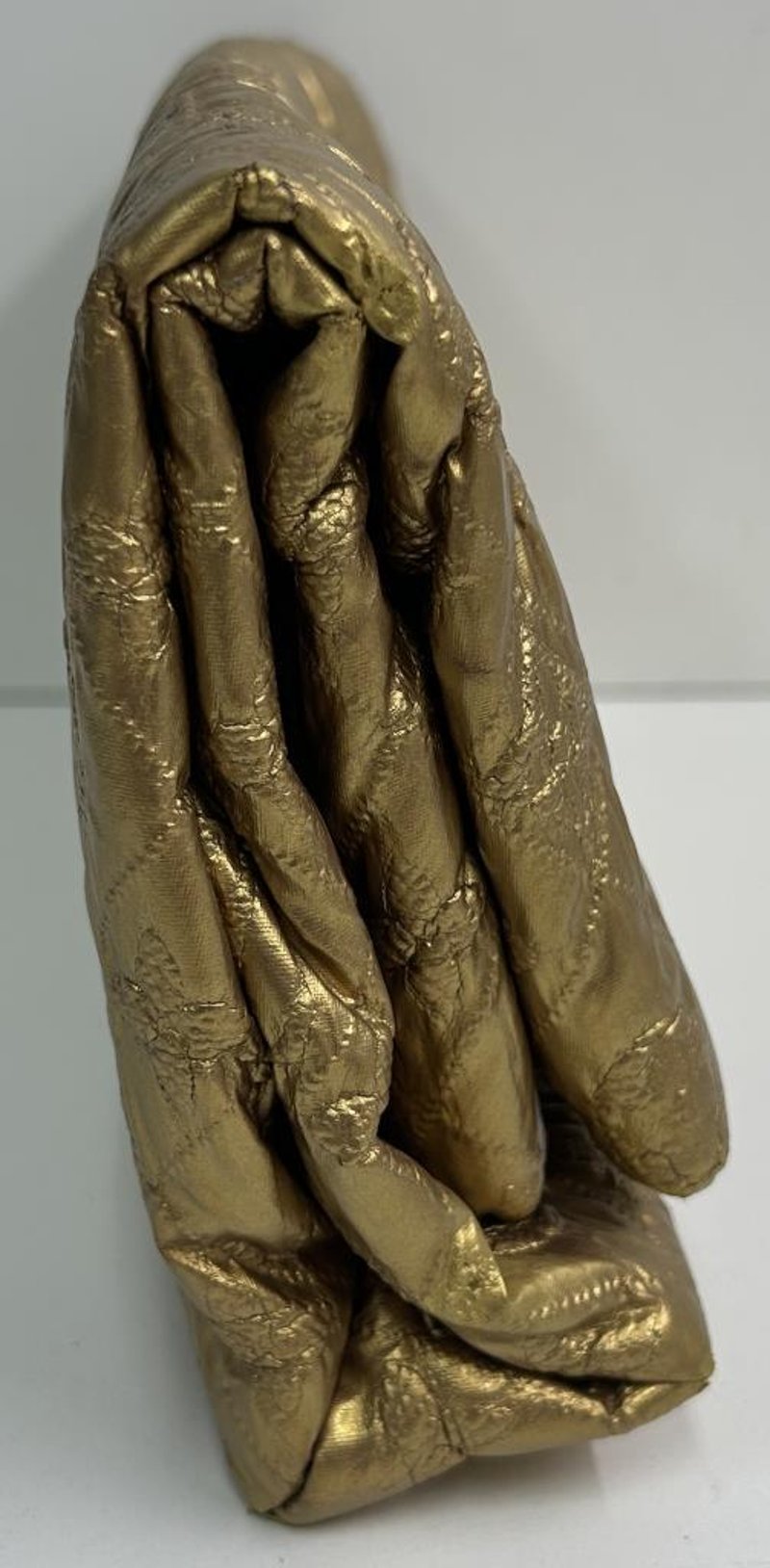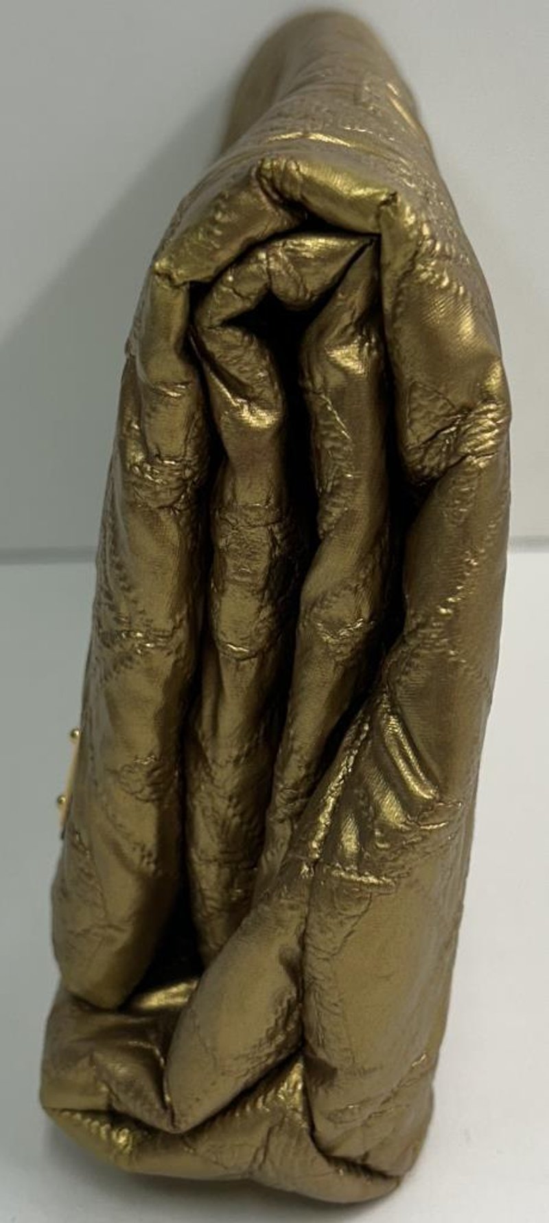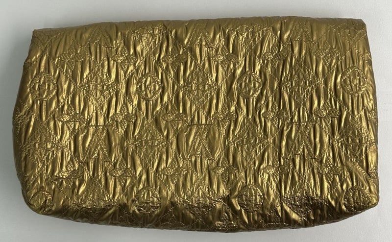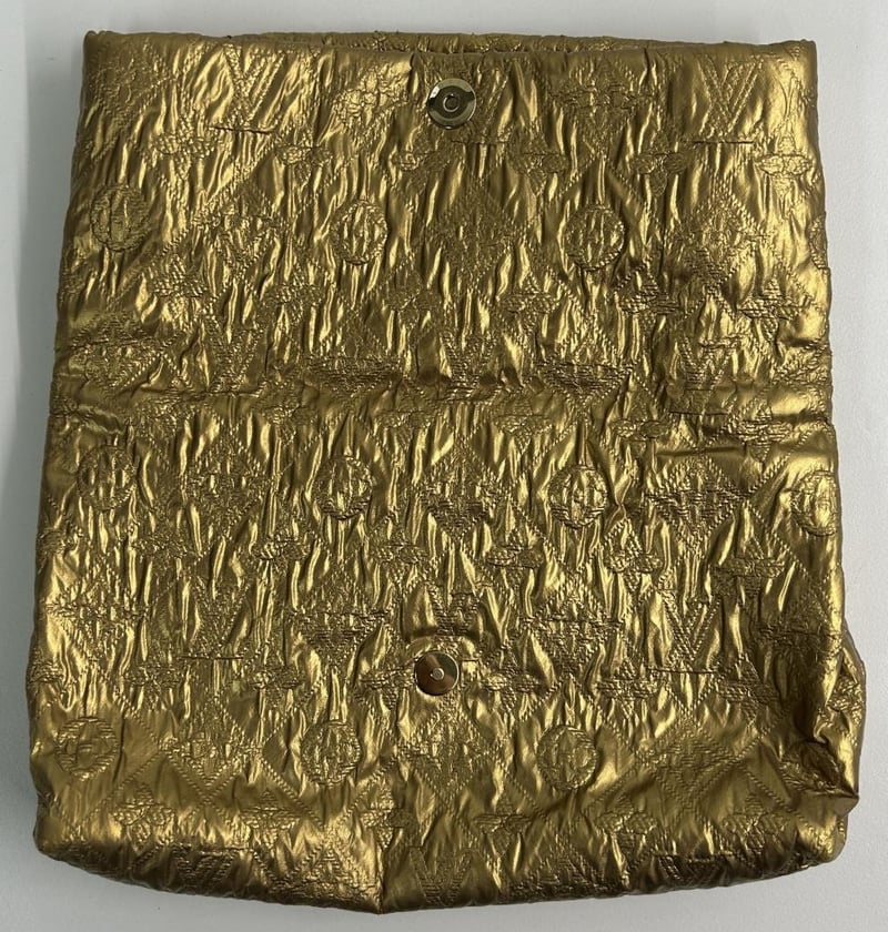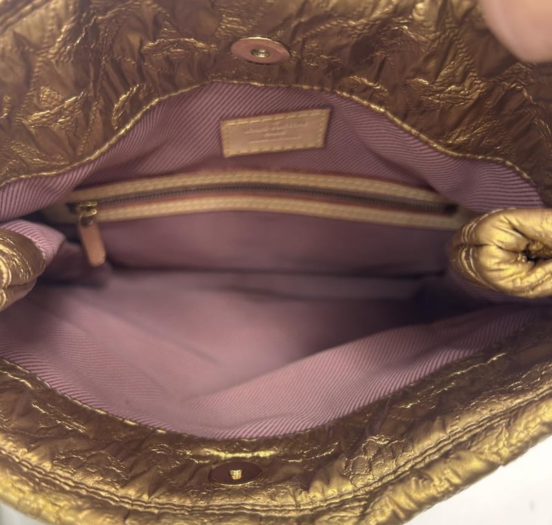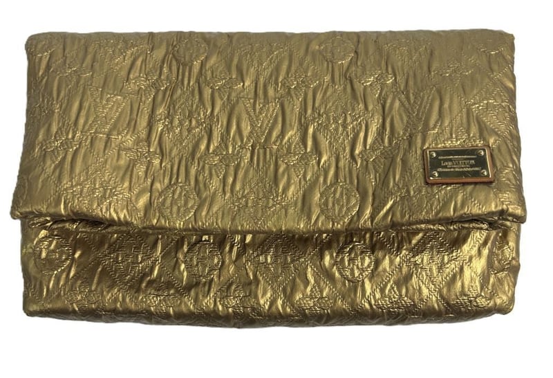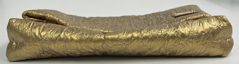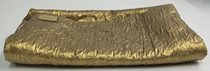 LOUIS VUITTON MONOGRAM GOLD QUILTED LIMELIGHT CLUTCH, FOLD OVER FLAP WITH MAGNETIC SNAP LOCK CLOSURE, GOLD TONE HARDWARE, MAUVE TEXTILE LINING WITH ZIP POCKET, MEASURES 24 X 15 X 5CM, MADE IN FRANCE. THIS ITEM HAS BEEN PROFESSIONALLY VERIFIED AS A GENUINE PRODUCT AND COMES WITH ACCOMPANYING 3RD PARTY CERTIFICATE OF AUTHENTICITY