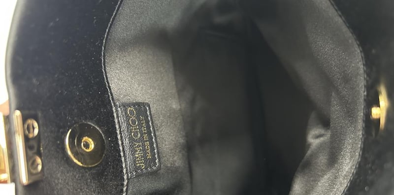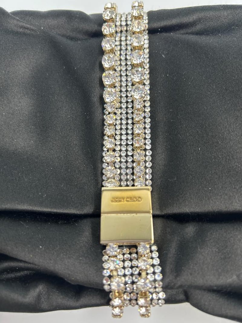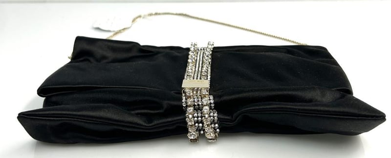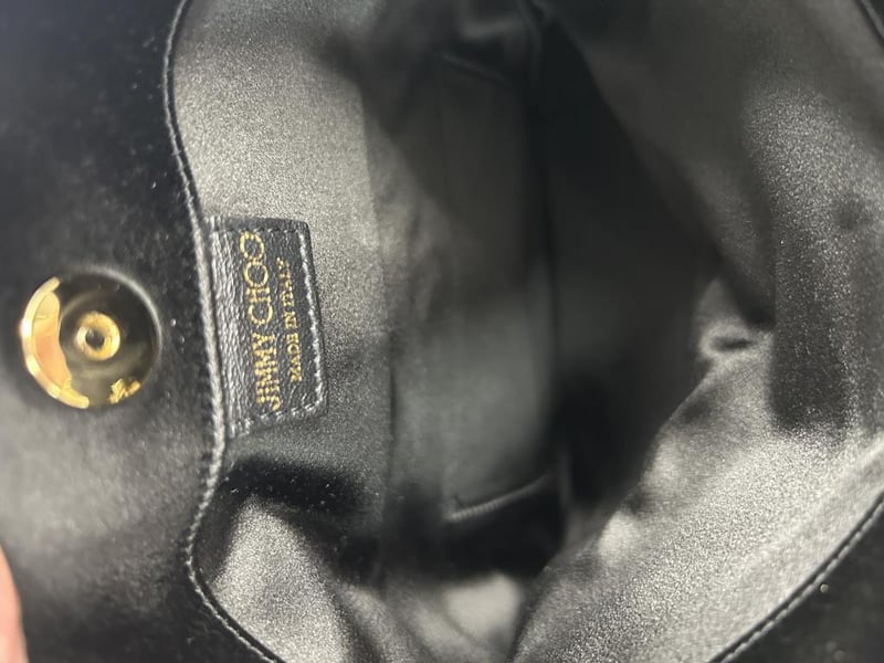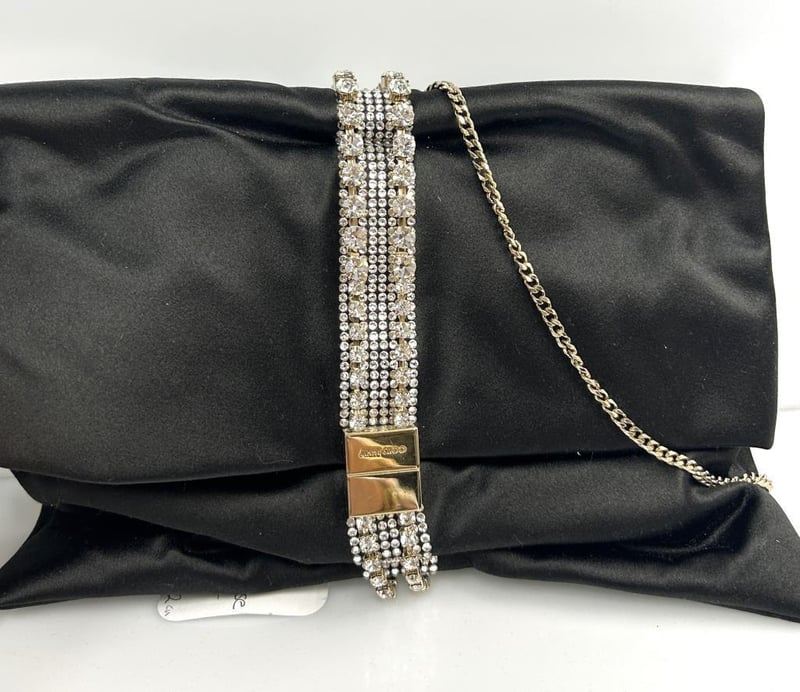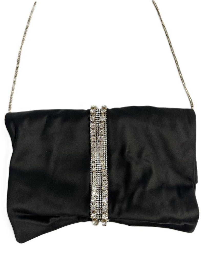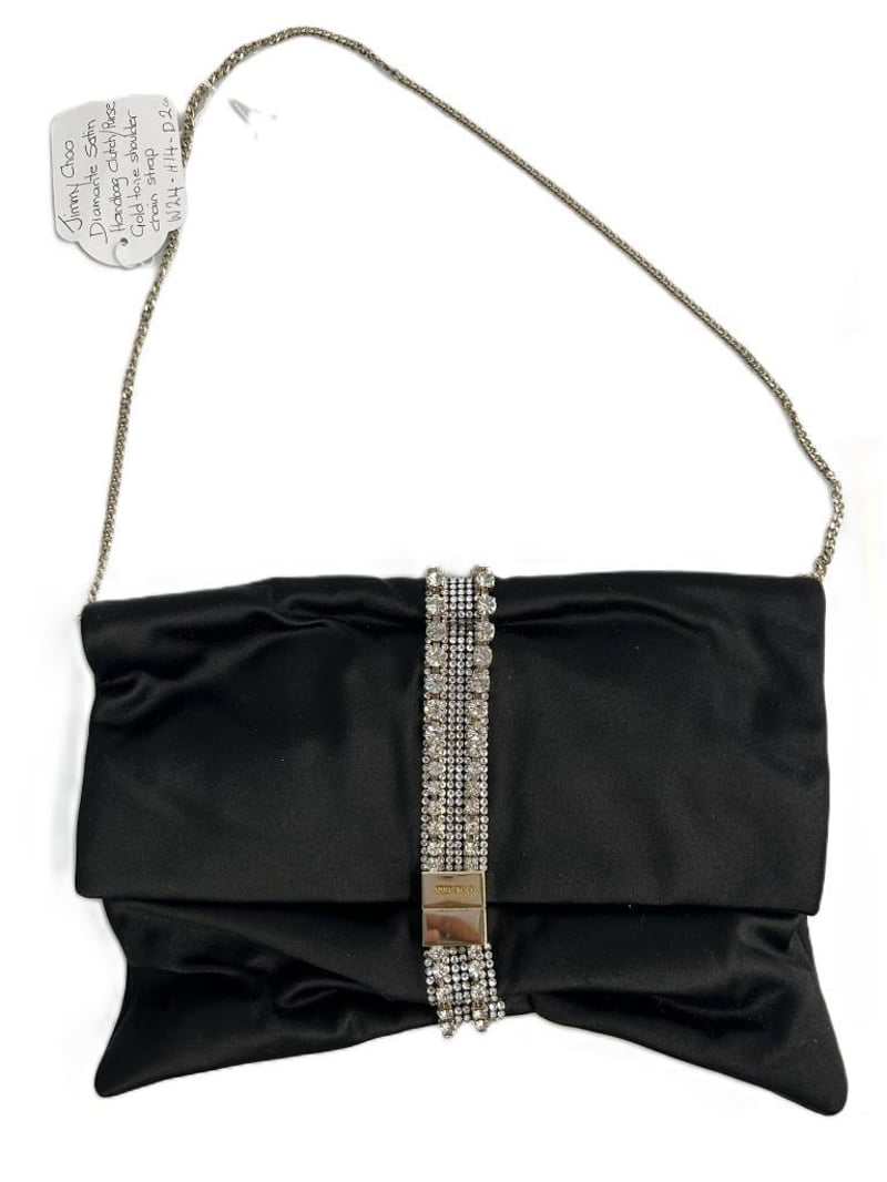 JIMMY CHOO DIAMANTE BLACK SATIN CLUTCH BAG, GOLD-TONE HARDWARE, REMOVABLE SHOULDER STRAP, FOLD OVER MAGNETIC & SNAP LOCK CLOSURE, BAG MEASURES 24 X 15 X 2.0CM, MADE IN ITALY, THIS ITEM HAS BEEN PROFESSIONALLY VERIFIED AS A GENUINE PRODUCT AND COMES WITH ACCOMPANYING 3RD PARTY CERTIFICATE OF AUTHENTICITY