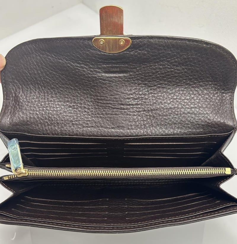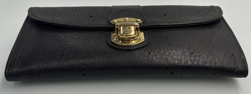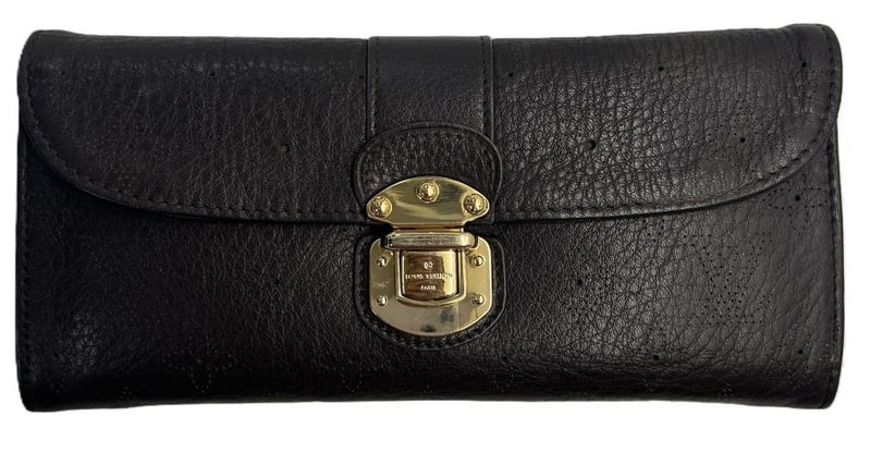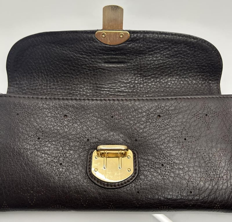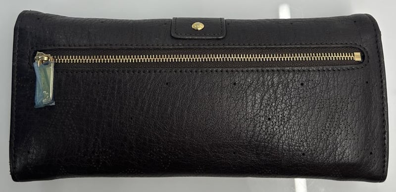 LOUIS VUITTON DARK BROWN PERFORATED LONG WALLET, GOLD-TONE HARDWARE, FOLD OVER PUSH LOCK CLOSURE, BACK ZIP POCKET, 16 CARD SLOTS, 4 SLIP POCKETS, 2 COMPARTMENTS, CENTRE ZIP POCKET, WALLET MEASURES 22 X 10.5 X 3.0, MADE IN FRANCE.