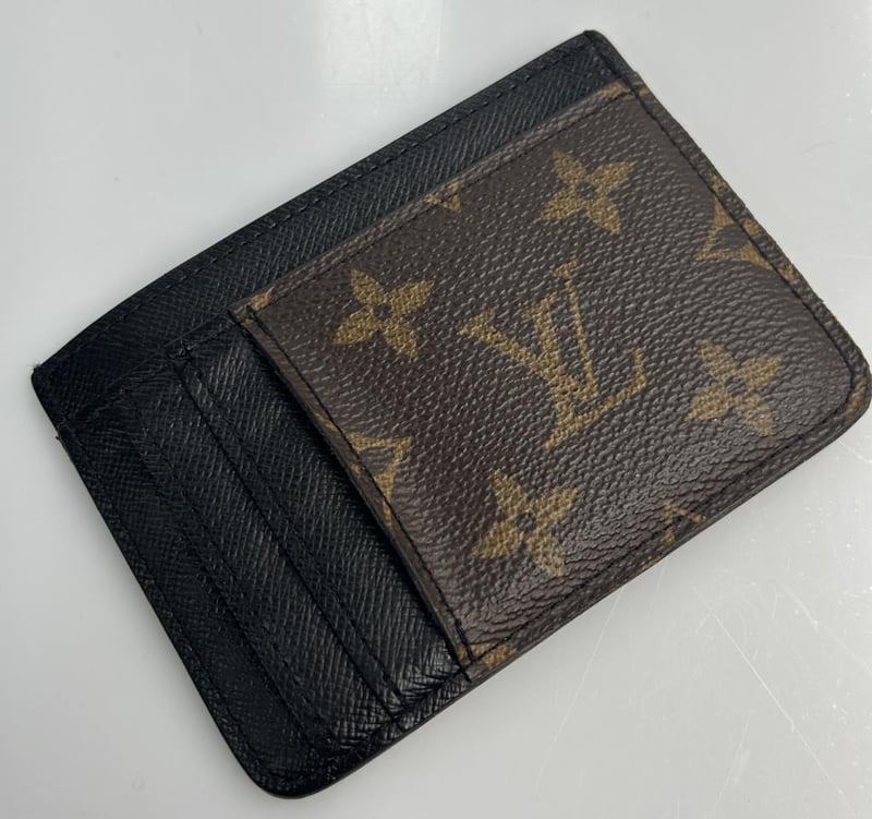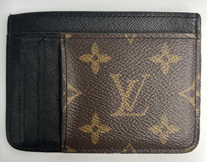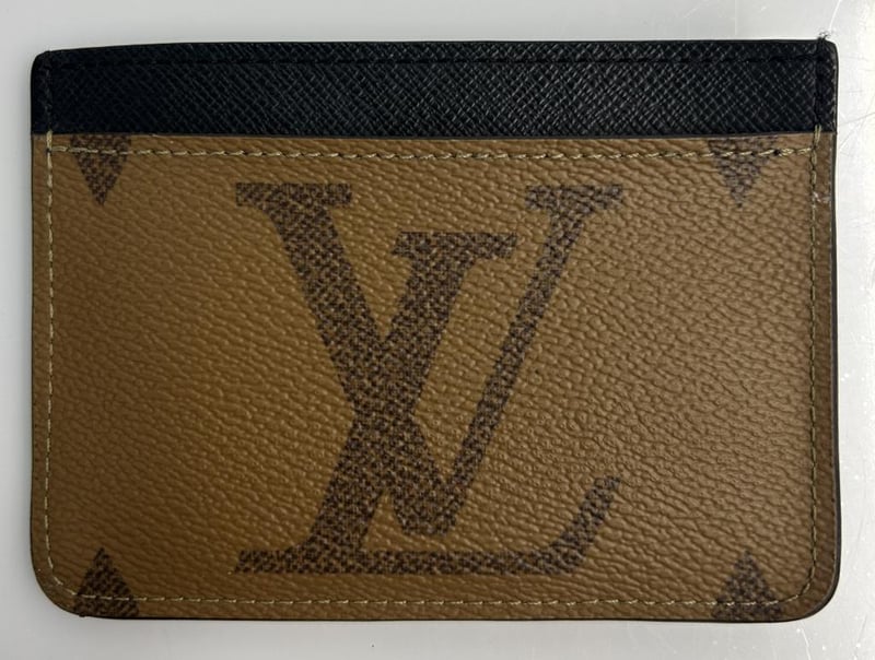 LOUIS VUITTON REVERSE PORTE CARTES LV SIDE UP CARD HOLDER, MONOGRAM COATED CANVAS & BLACK LEATHER, 3 CARD SLOTS, 3 SLIP POCKETS, CARD HOLDER MEASURES 11.5 X 8.5CM, MADE IN FRANCE.