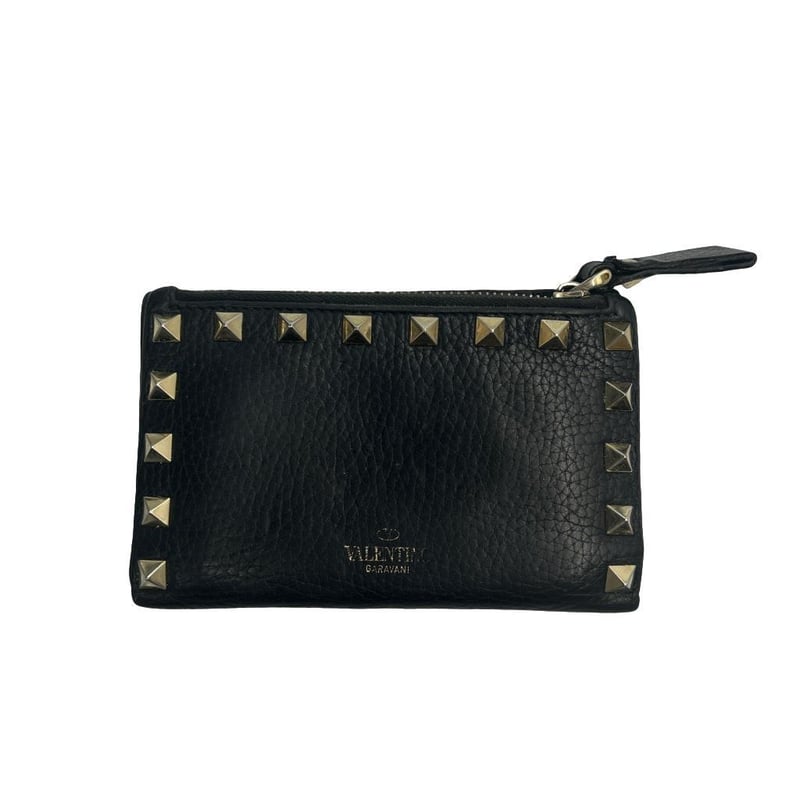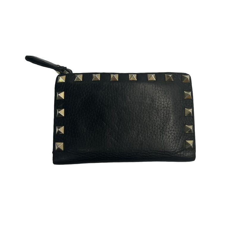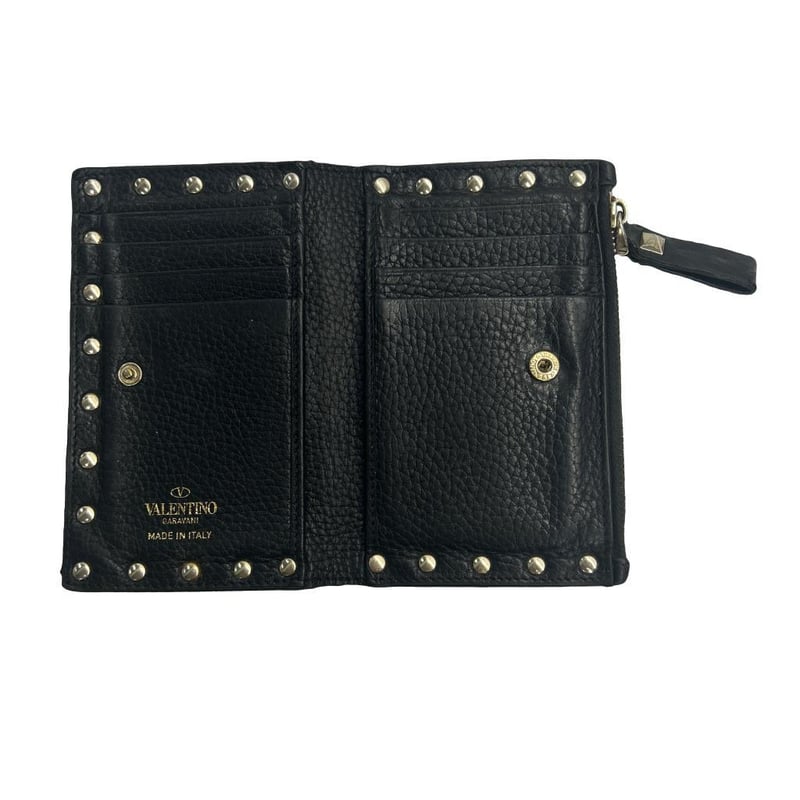 VALENTINO GARAVANI ROCKSTUD BI-FOLD WALLET, BLACK CALFSKIN LEATHER WITH GOLD-TONE HARDWARE, DOME CLOSURE, 8 CARD SLOTS, 2 SLIP POCKETS, ZIPPERED COIN COMPARTMENT, MEASURES13 X 8CM, MADE IN ITALY, INCLUDES DUST COVER. THIS ITEM HAS BEEN PROFESSIONALLY VERIFIED AS A GENUINE PRODUCT AND COMES WITH ACCOMPANYING 3RD PARTY CERTIFICATE OF AUTHENTICITY