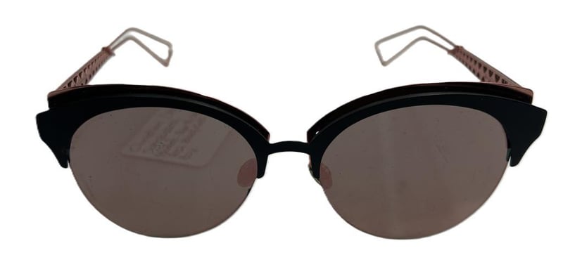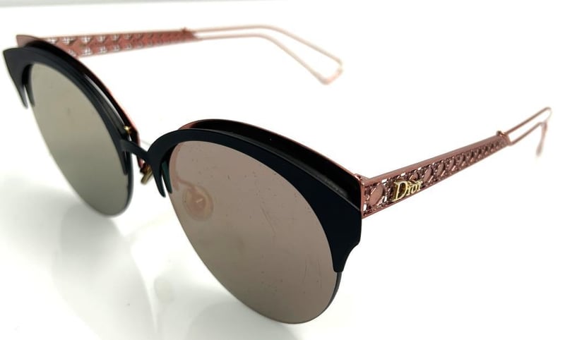 DIOR SIDERAL 2 SUNGLASSES FEATURING ROSE GOLD-TONE METAL FRAMES WITH BLACK ENAMEL BROW DETAILING, PINK MIRRORED LENSES, AND SIGNATURE LATTICE-CUT TEMPLES ADORNED WITH A GOLD DIOR LOGO. MADE IN ITALY.