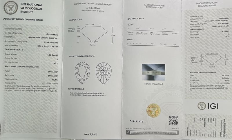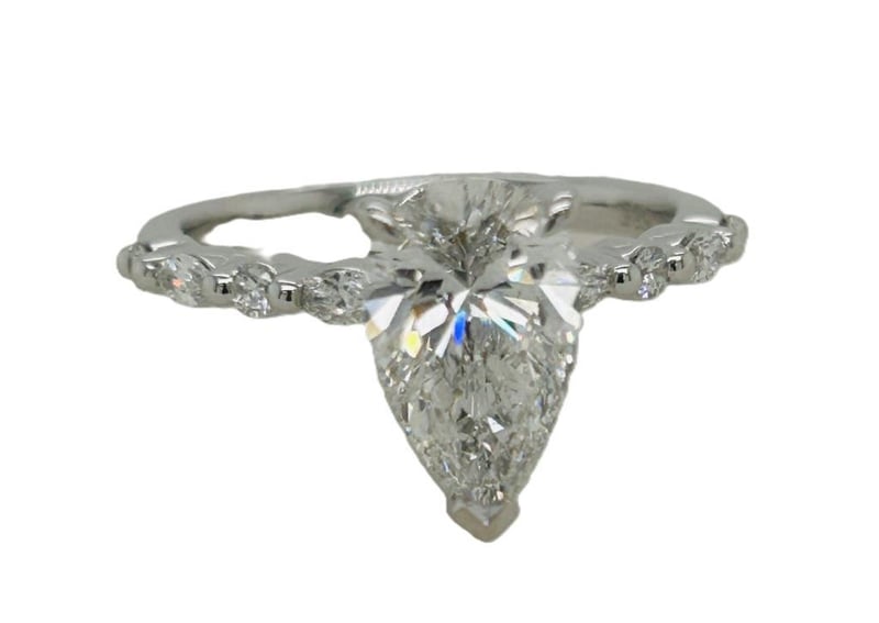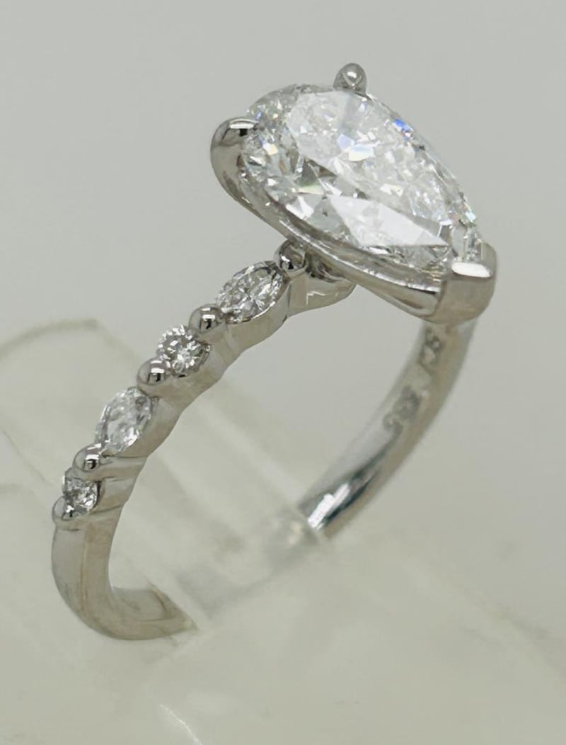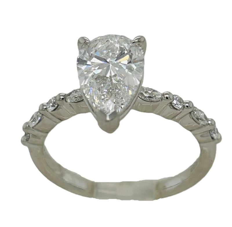 14CT WHITE GOLD 1.74CT DIAMOND RING, PEAR CUT 1.54CT LABORATORY DIAMOND 2 CLAW & V CAP SET WITH 2 MARQUISE & 2 ROUND BRILLIANT CUT LABORATORY DIAMOND CHANNEL SET ON EACH SHOULDER, TOTAL DIAMOND WEIGHT 1.74CT E VS1, RING WEIGHT 3.15 GRAMS, STAMP SCJ 585 LG. THIS ITEM HAS BEEN PROFESSIONALLY VERIFIED AS A GENUINE PRODUCT AND COMES WITH ACCOMPANYING RECEIPT & 3RD PARTY IGI LABORATORY DIAMOND REPORT.