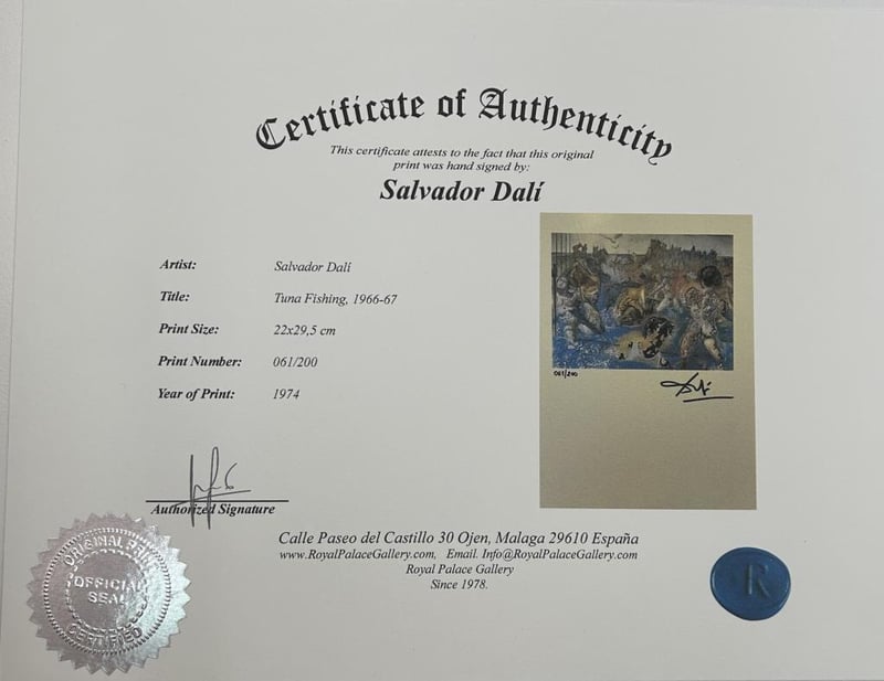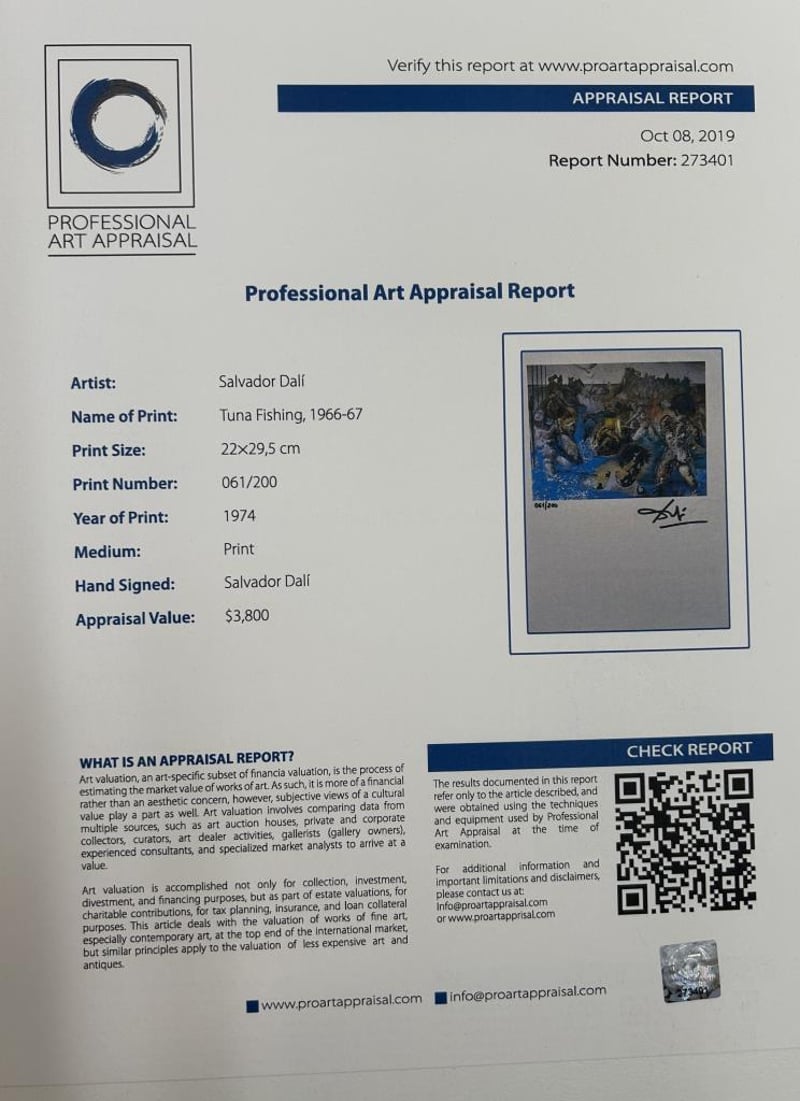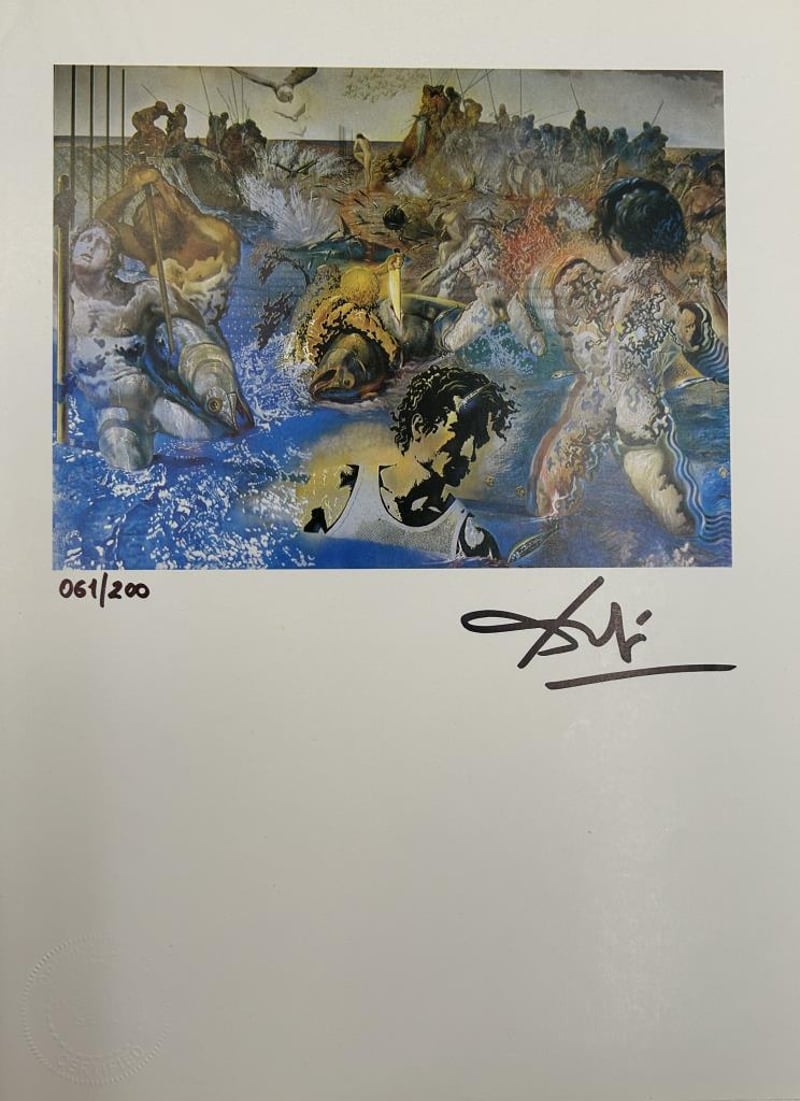 SALVADOR DALI 'TUNA FISHING' 1966-67 LIMITED EDITION PRINT, HAND SIGNED, 061/200 PRINTED IN 1974, PRINT MEASURES 22 X 29.5CM, INCLUDES CERTIFICATE OF AUTHENTICITY, CERTIFICATE OF ORIGIN & PROFESSIONAL APPRAISAL VALUATION $3,800 USD.