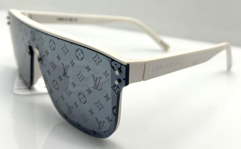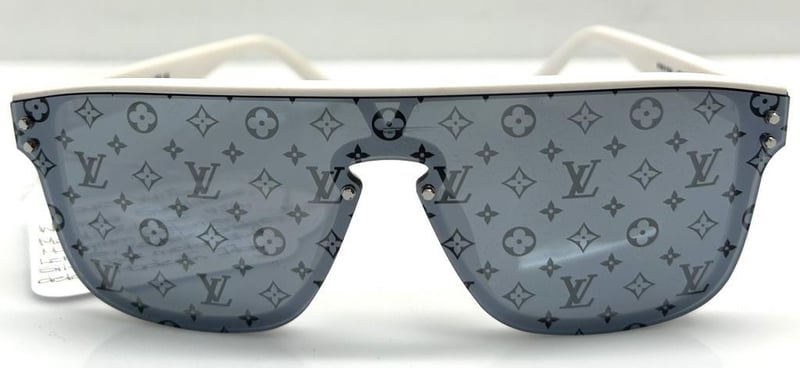LOUIS VUITTON Z1082E WAIMEA SUNGLASSES, MONOGRAM PATTERNED LENSES WITH SILVER-TONE STUDS, WHITE ARMS WITH LOUIS VUITTON INSCRIPTION, MADE IN ITALY.