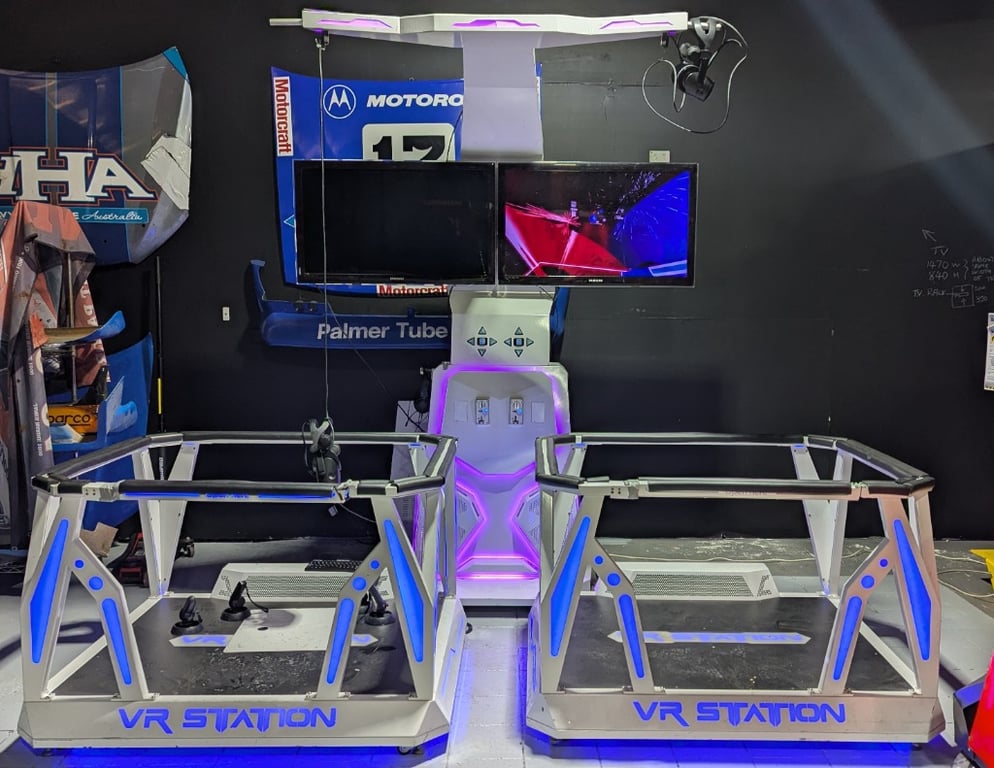double platforms for dual play, VR headsets with built in headphones, game paddles, Samsung screens, coloured led lighting
