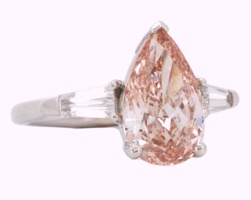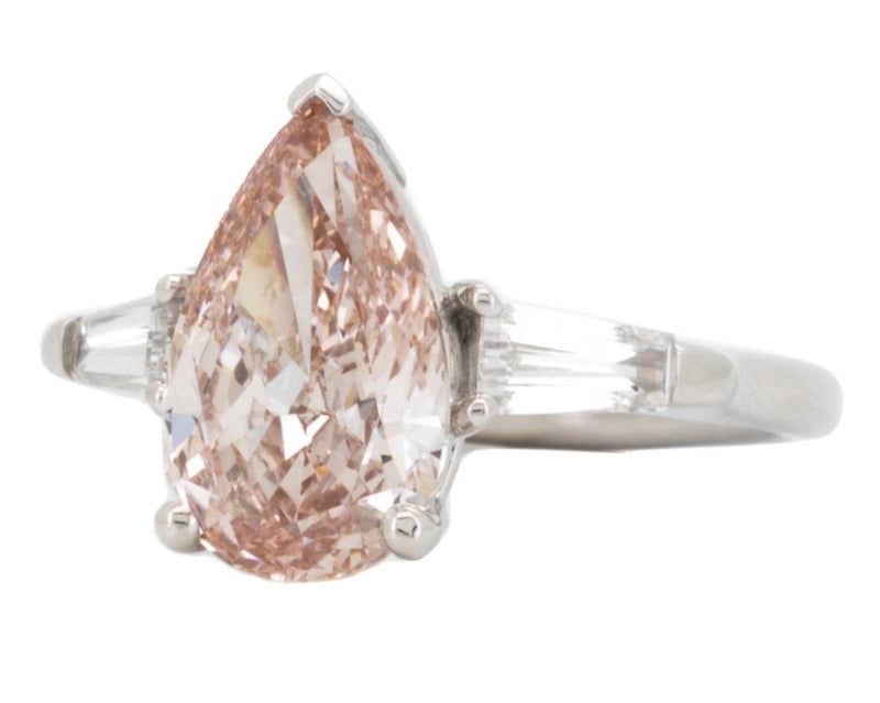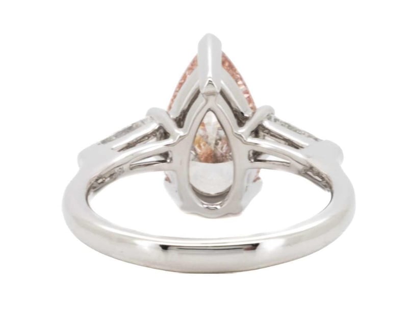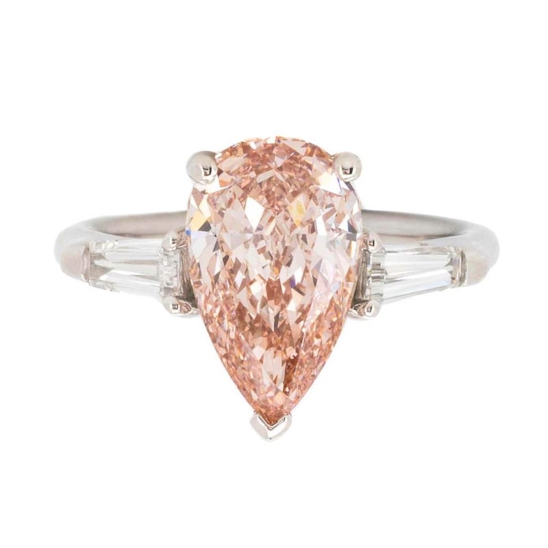 Made In 18K White Gold Centre Diamond = 3.16 Carat Pear Cut Fancy Intense Pink Vs1 Igi Certificate # Lg 602398843 Laser Inscribed : Labgrown Igi Lg 602398843 Polish : Excellent Symmetry : Excellent Flourescence : Slight Type : Cvd Shoulder Diamonds 2 Taper Baguette Diamonds = 0.56 Carats Ring Finger Size M.25 Ring Weight 5.40 Grams