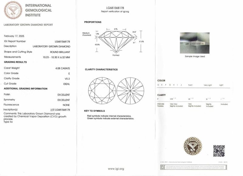 4.08 Carat Round Brilliant Diamond E/Vs2 Igi Certificate # Lg 681568178 Laser Inscribed : Labgrown Igi Lg 681568178 Cut : Ideal Polish : Excellent Symmetry : Excellent Flourescence : Non Type : Cvd Total Ring Weight 5.90 Grams. Ring Finger Size N