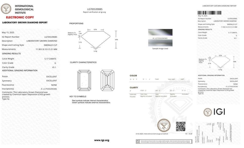5.17 CARAT EMERALD CUT DIAMOND G/VS1 Igi Certificate # Lg 705539085 Laser Inscribed : Labgrown Igi Lg 705539085 Polish : Excellent Symmetry : Excellent Flourescence : None Type : Cvd Condition: Good - Refer Images 0488970+60