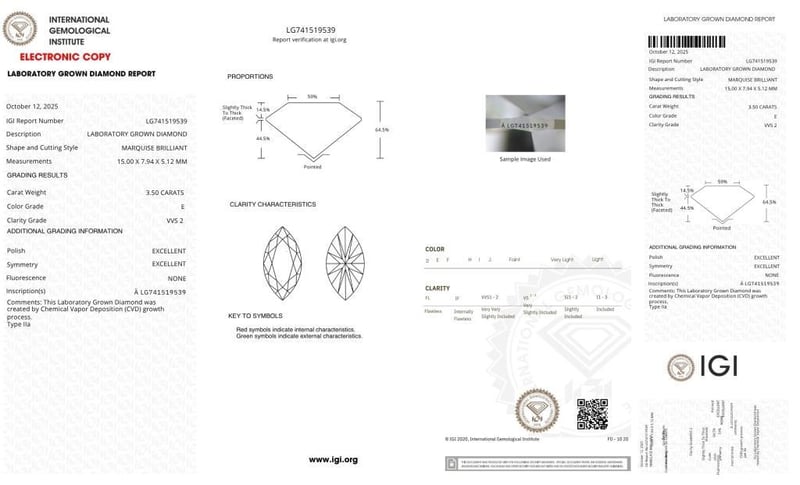 Igi Certificate # Lg 741519539 Laser Inscribed : Labgrown Igi Lg 741519539 Polish : Excellent Symmetry : Excellent Flourescence : None Type : Cvd
