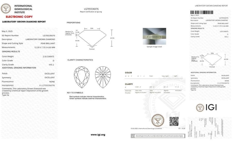 2.55 CARAT PEAR SHAPE DIAMOND D/VVS2 Igi Certificate # 705536076 Laser Inscribed : Labgrown Igi 705536076 Polish : Excellent Symmetry : Excellent Flourescence : None Type : Cvd Condition: Good - Refer Images 0488970+57