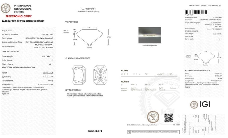 Igi Certificate # 706502484 Laser Inscribed : Labgrown Igi 706502484 Polish : Excellent Symmetry : Excellent Flourescence : None Type : Cvd