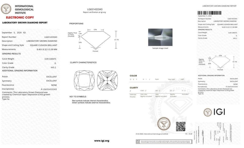 Igi Certificate # Lg 651433343 Laser Inscribed : Labgrown Igi Lg 651433343 Polish : Excellent Symmetry : Excellent Flourescence : None Type : Cvd