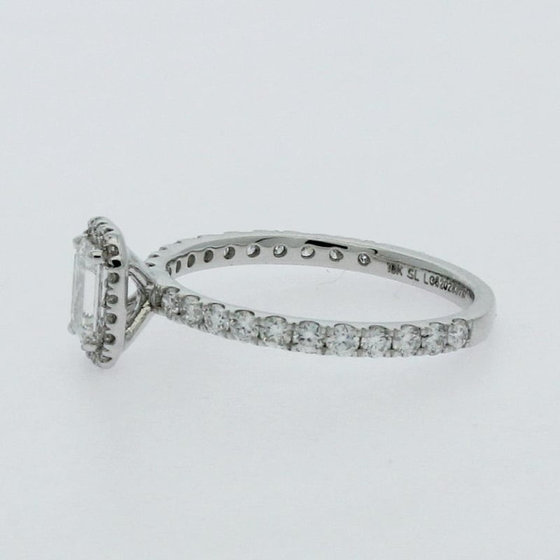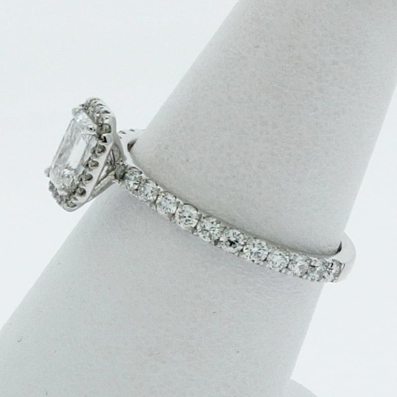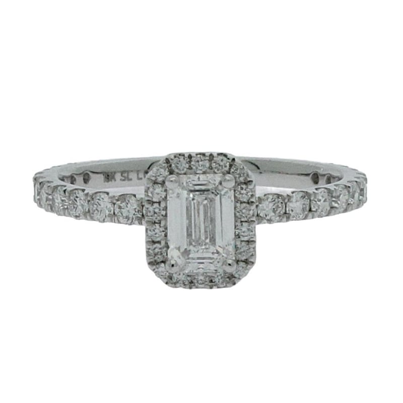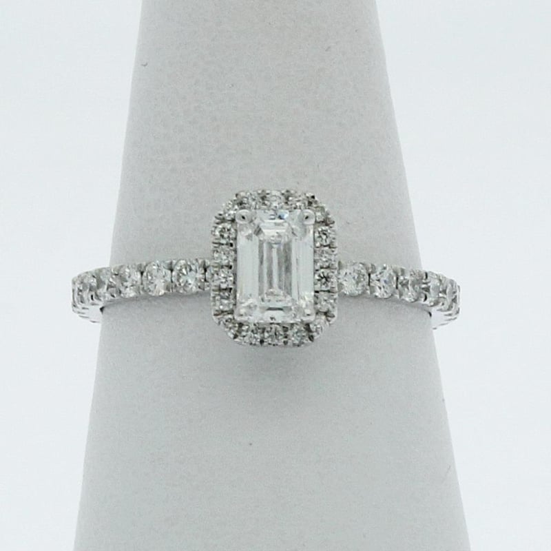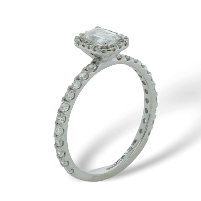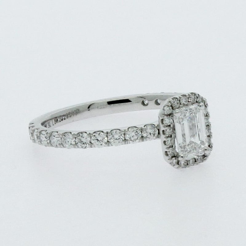Centre Diamond = 0.53 Carat Emerald Shape Lab Grown Diamond F/Vs Shoulder Diamonds 41 Round Brilliant = 0.57 Carats, Ring Finger Size M Ring Weight 2.25 Grams