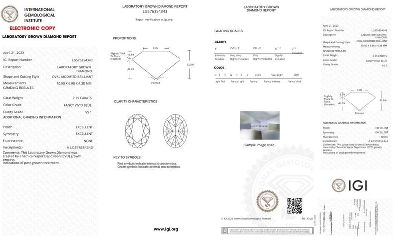 Igi Certificate # Lg 576354343 Laser Inscribed : Labgrown Igi Lg 576354343 Polish : Excellent Symmetry : Excellent Flourescence : None Type : Cvd