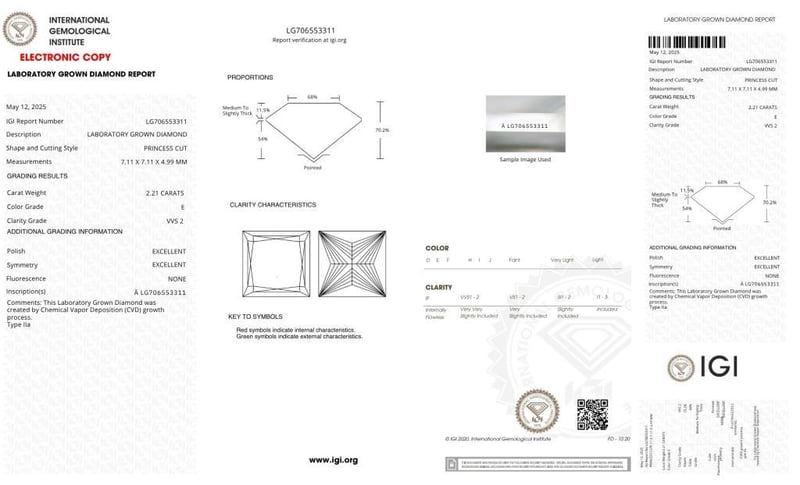 Igi Certificate # Lg 706553311 Laser Inscribed : Labgrown Lg 706553311 Polish : Excellent Symmetry : Excellent Flourescence : None Type : Cvd