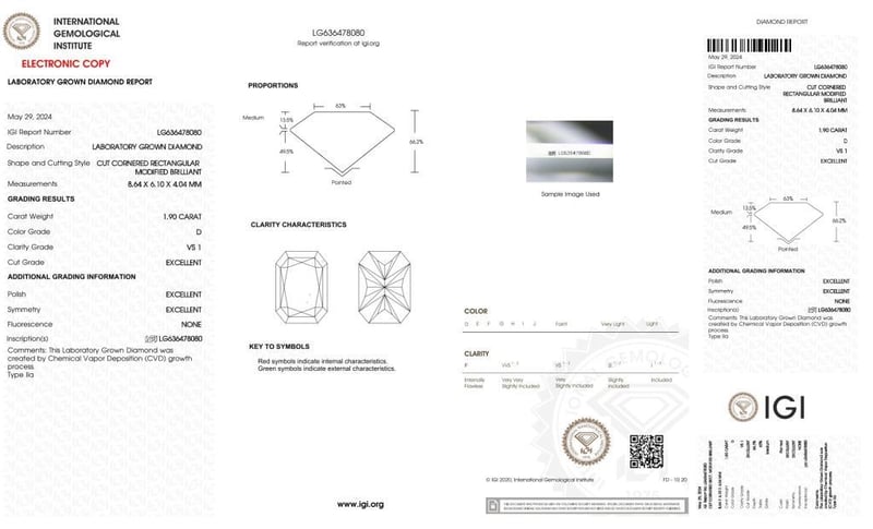 Igi Certificate # Lg 636478080 Laser Inscribed : Labgrown Igi Lg 636478080 Cut : Excellent Polish : Excellent Symmetry : Excellent Flourescence : None Type : Cvd