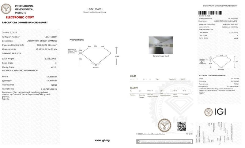 2.33 MARQUISE SHAPED DIAMOND E/VVS2 Igi Certificate # Lg 741504091 Laser Inscribed : Labgrown Igi Lg 741504091 Polish : Excellent Symmetry : Excellent Flourescence : None Type : Cvd Condition: Good - Refer Images 0488970+21