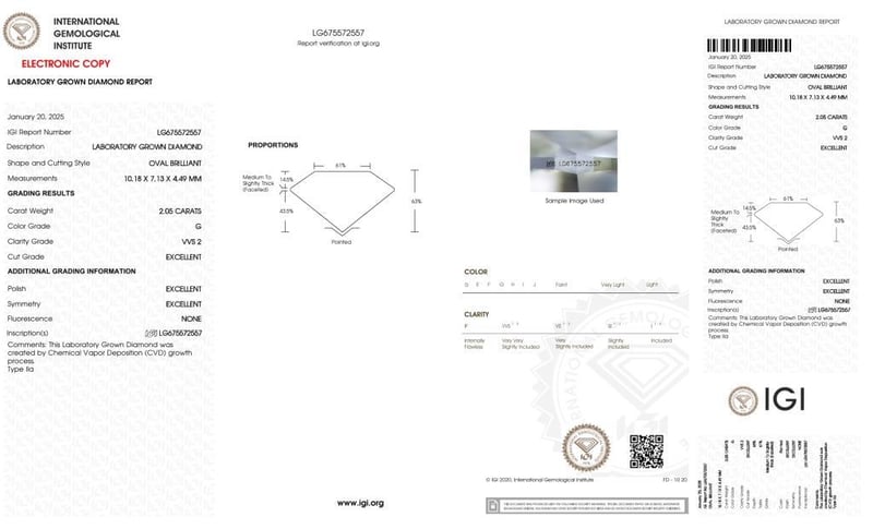 Igi Certificate # Lg 675572557 Laser Inscribed : Labgrown Igi Lg 675572557 Cut : Excellent Polish : Excellent Symmetry : Excellent Flourescence : None Type : Cvd
