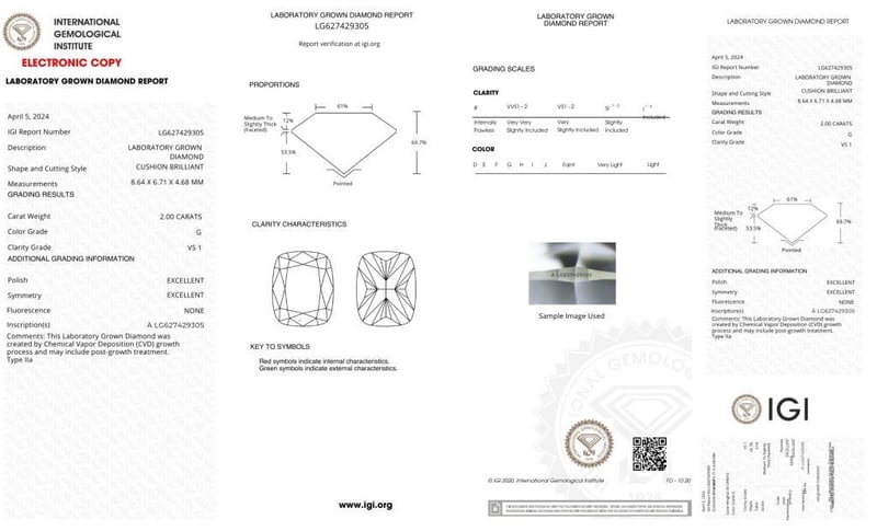 Igi Certificate # Lg 627429305 Laser Inscribed : Labgrown Igi Lg 627429305 Polish : Excellent Symmetry : Excellent Flourescence : None Type : Cvd