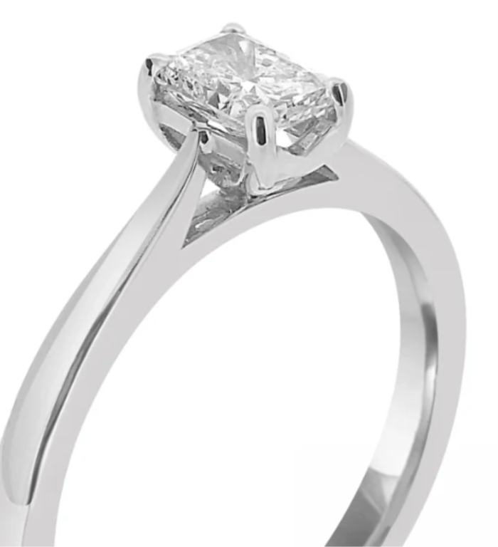 Radiant Cut Diamond Solitaire RingA radiant-cut 0.50ct diamond of exceptional D colour and SI1 clarity set in a platinum (950) band. Elegant and timeless, with a modern brilliance. GIA certified and presented in new condition.Ring Size: M