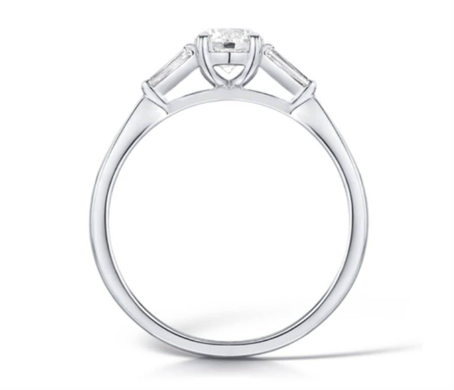 Round Brilliant Solitaire with Baguette Side StonesAn elegant platinum (950) ring showcasing a 0.50ct round brilliant centre diamond accented by 0.12ct baguette side stones. Graded F colour and SI2 clarity, providing balanced brilliance and grace. GIA certified and new.Ring Size: M