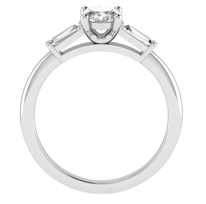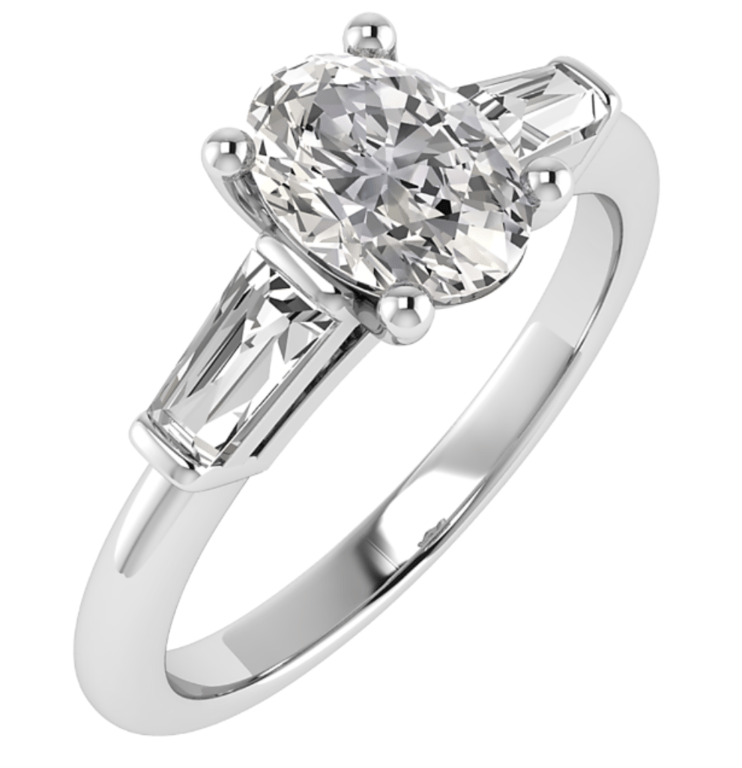 Oval Cut Diamond Solitaire with Baguette Side StonesThis graceful platinum (950) ring features a 0.38ct oval-cut centre diamond with 0.15ct baguette side stones. The stones are E colour and VVS2 clarity, offering exceptional sparkle and quality. Supplied new with GIA certification.Ring Size: M