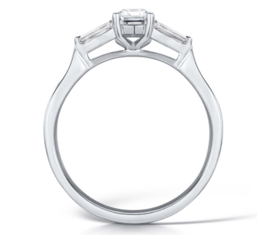 Emerald Cut Solitaire with Baguette Side StonesA sophisticated platinum (950) ring featuring a 0.41ct emerald-cut centre diamond accented by 0.17ct baguette side stones. The diamonds are E colour and VVS2 clarity, delivering brilliance and precision. GIA certified and new.Ring Size: M