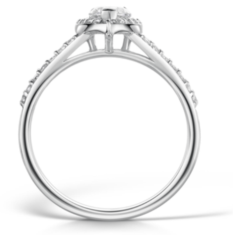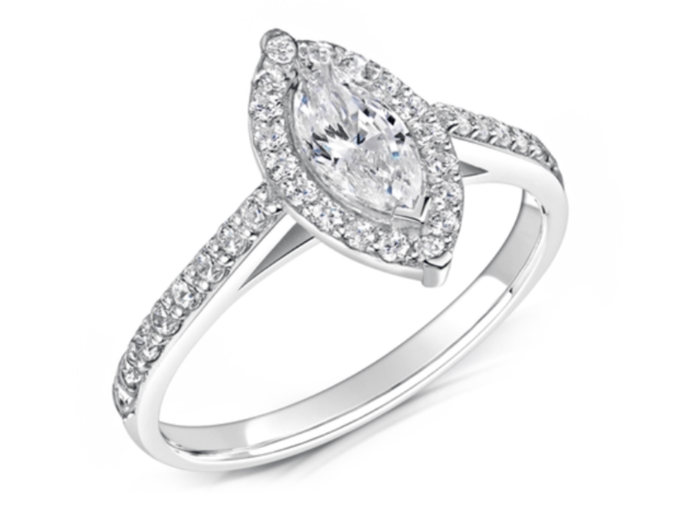 Marquise Diamond with Halo & ShouldersA beautifully crafted platinum (950) ring featuring a 0.30ct marquise-cut diamond framed by 0.30ct of round brilliant halo and shoulder stones. Graded D colour and SI1 clarity, this ring exudes refined brilliance. GIA certified and presented in new condition.Ring Size: M