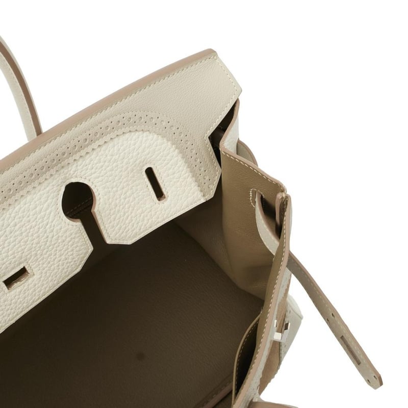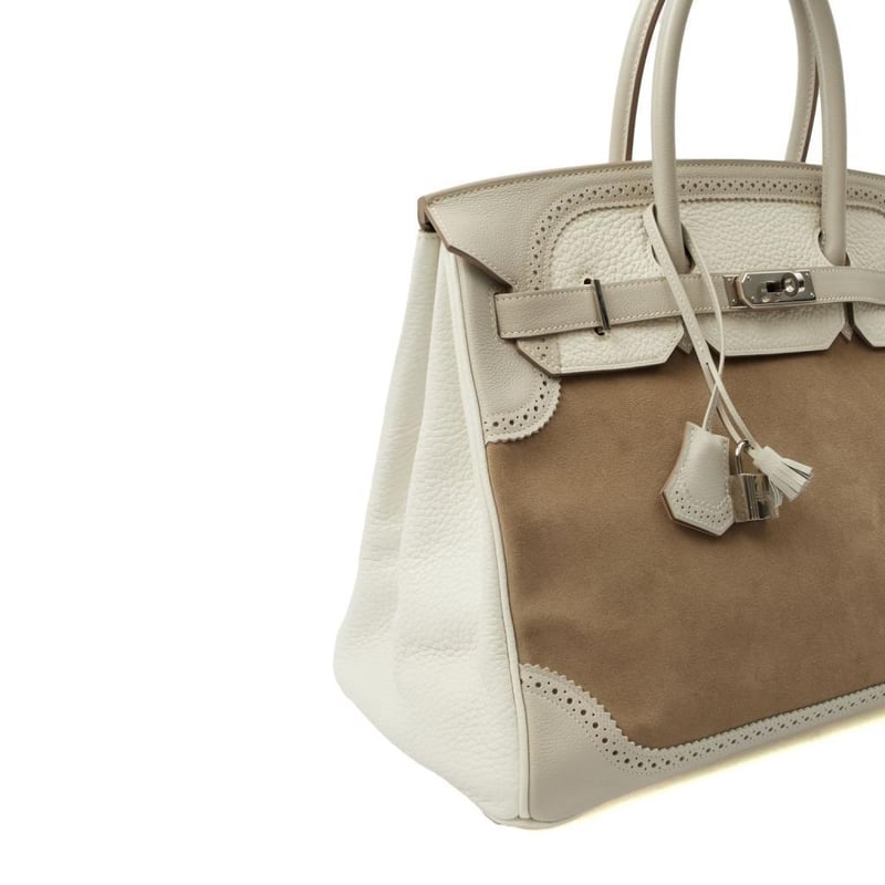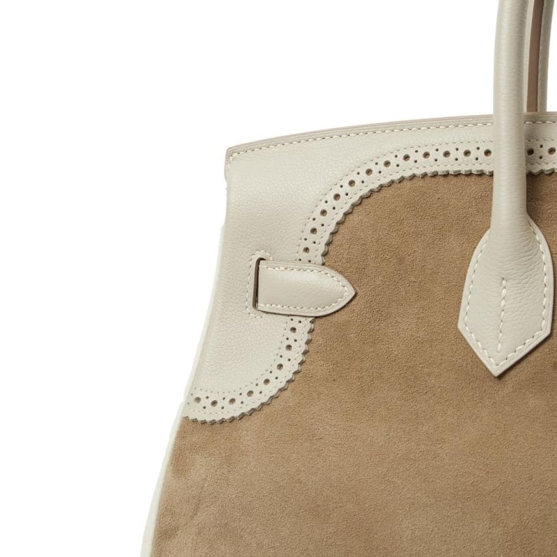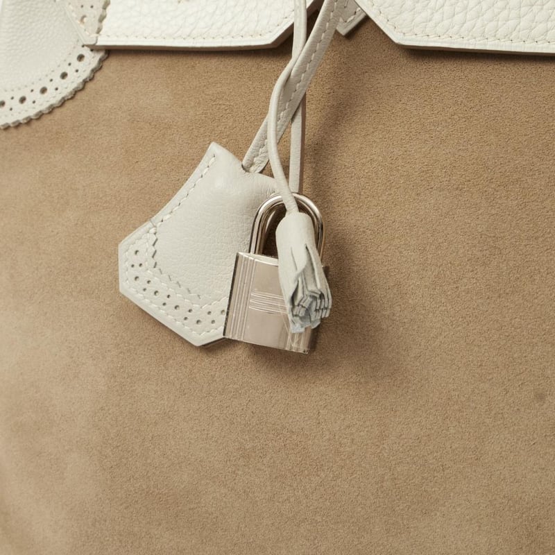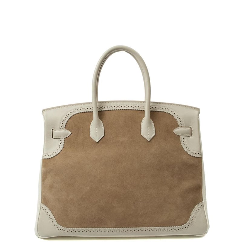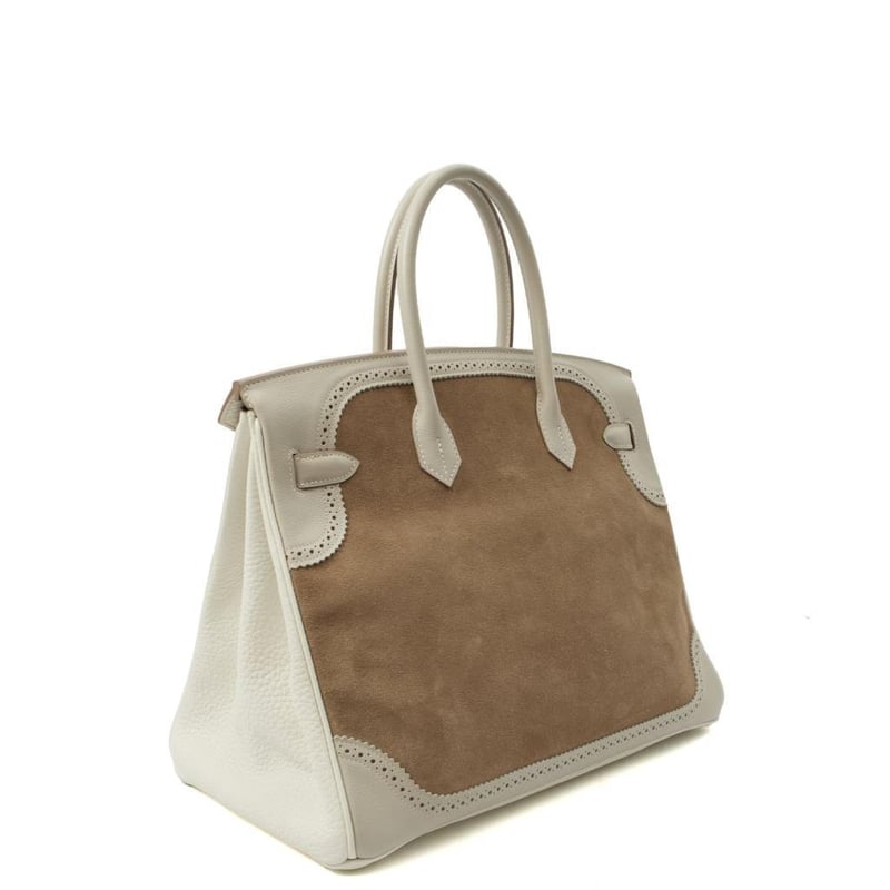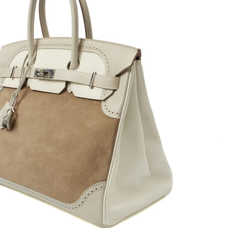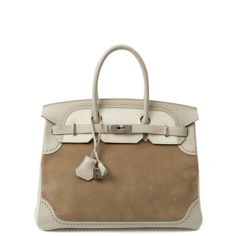 Hermes Gris Perle Birkin 35 Tote Rare Limited Edition Hermes Birkin 35 “Grizzly Ghillies” in a tri-colour mix of suede and leather. A highly collectible piece of Hermes history. Manufacturer Colour Name: Gris Caillou, Gris Perle & Blanc Material: Suede, Epsom Leather, and Clemence Leather Age: 1992 HxWxD: 25 x 35 x 18 cm Condition: Excellent Condition Guide The bags we sell are listed under the following grades of quality: Brand New: These bags have never been used and show no signs of wear. Excellent: These bags have had minimal use and show no signs of wear. Great: These bags are in fantastic condition with very little signs of wear Very Good: These bags will show minor signs of wear and imperfections. Good: These bags will show signs of wear and have small imperfections. Fair: Often reserved for vintage items, fair condition items will have been loved by their previous owner and show signs of wear or aging.
