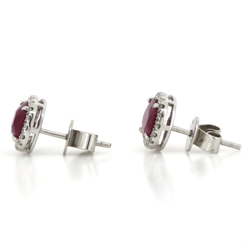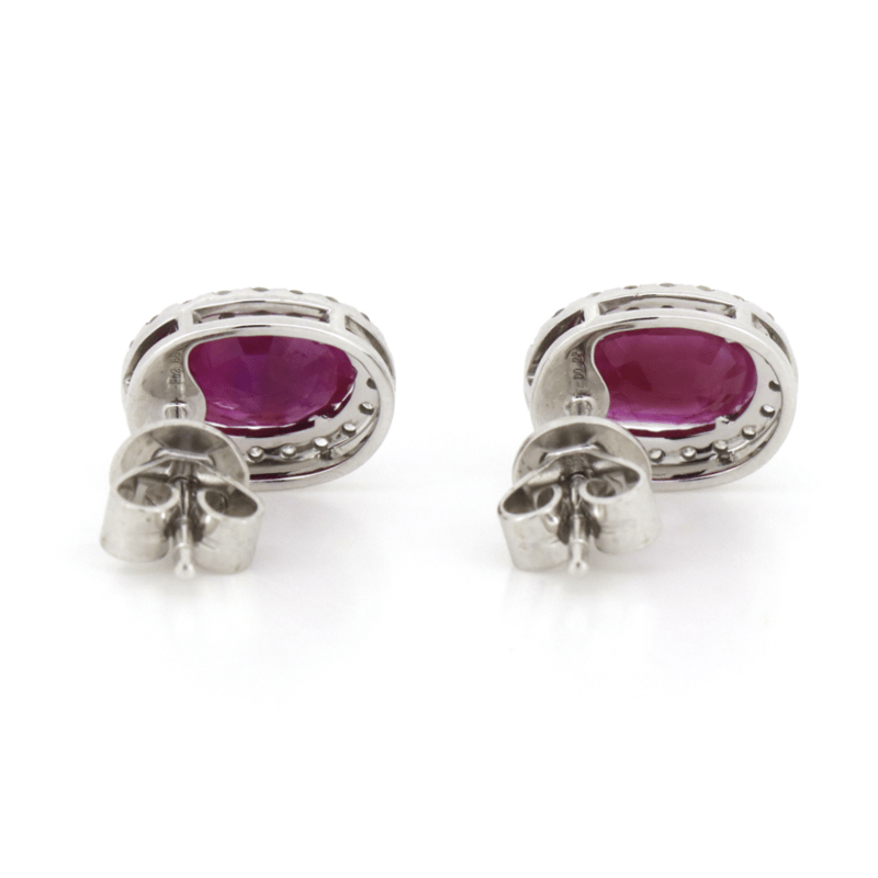 14K WHITE GOLD, RUBY AND DIAMOND, HALO STUD EARRINGS. THE CENTRES FEATURE, 2 OVAL CUT, MEDIUM PURPLISH-RED, RUBIES (2.66CT TSW, INCLUDED), 4 CLAW SET. SURROUNDING THE CENTRES IN HALOS ARE, 40 ROUND BRILLIANT CUT, DIAMONDS (0.23CT TDW, J-K COLOUR, SI2-I2 CLARITY), MICRO-CLAW SET. THE EARRINGS HAVE POST BACKS, WITH 14K WHITE GOLD BUTTERFLY CLASPS.