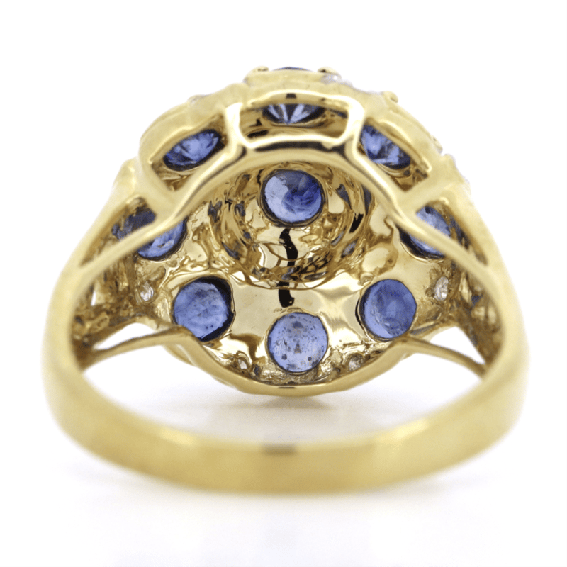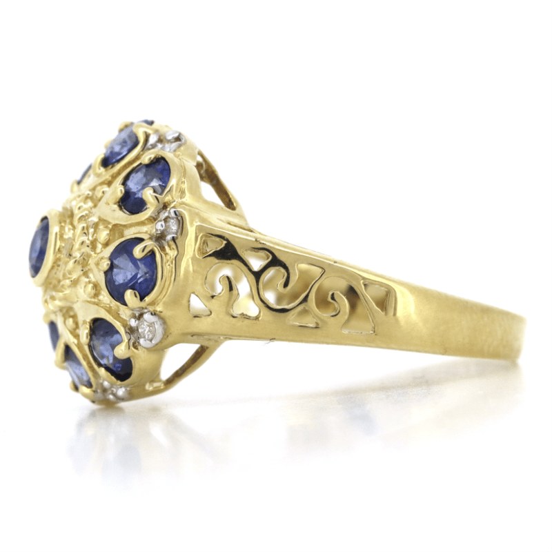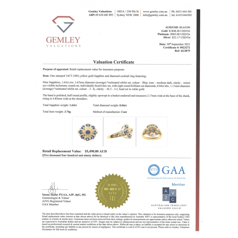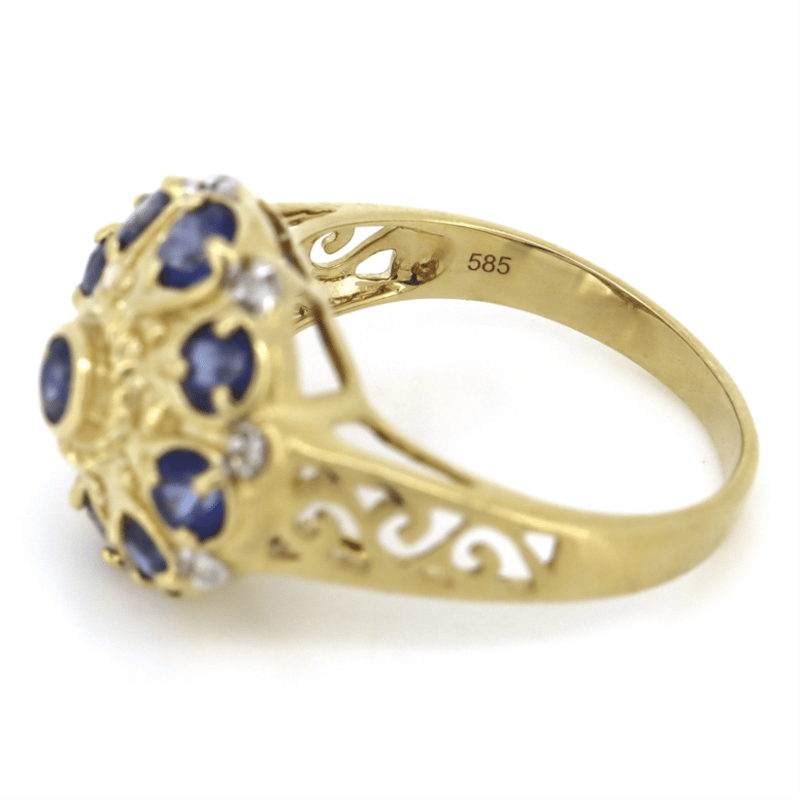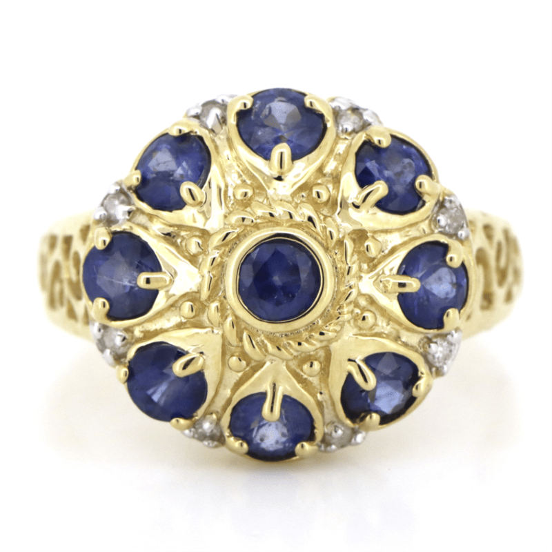14K YELLOW GOLD, BLUE SAPPHIRE AND DIAMOND, ART DECO INSPIRED RING. THE DESIGN FEATURES, 9 ROUND CUT, MEDIUM DARK BLUE, SAPPHIRES (1.63CT TSW, MINOR EYE VISIBLE INCLUSIONS), BEZEL/CLAW SET. DECORATING IN BETWEEN THE DESIGN ARE, 8 ROUND BRILLIANT CUT, DIAMONDS (0.04CT TDW, I-J COLOR, SI2-I2 CLARITY), BEAD SET IN WHITE GOLD. RING SIZE L.
