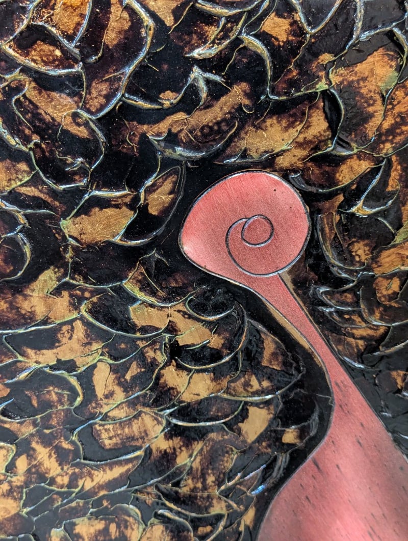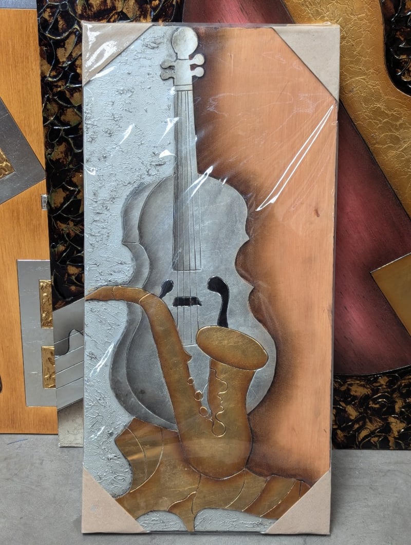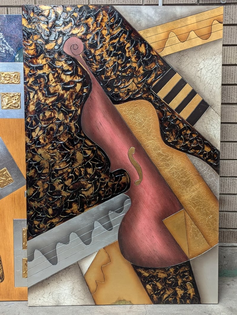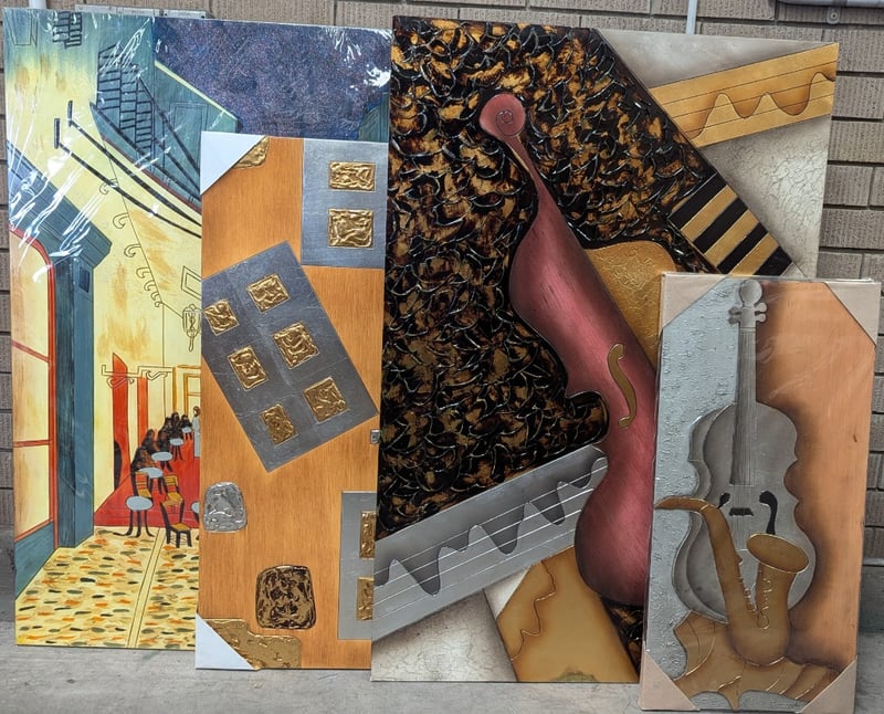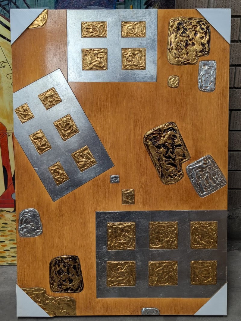 FOUR MIXED MEDIA ARTWORKS ON TIMBER PANEL