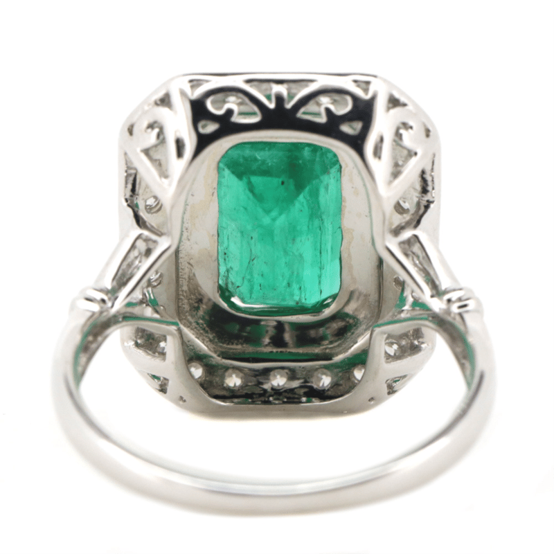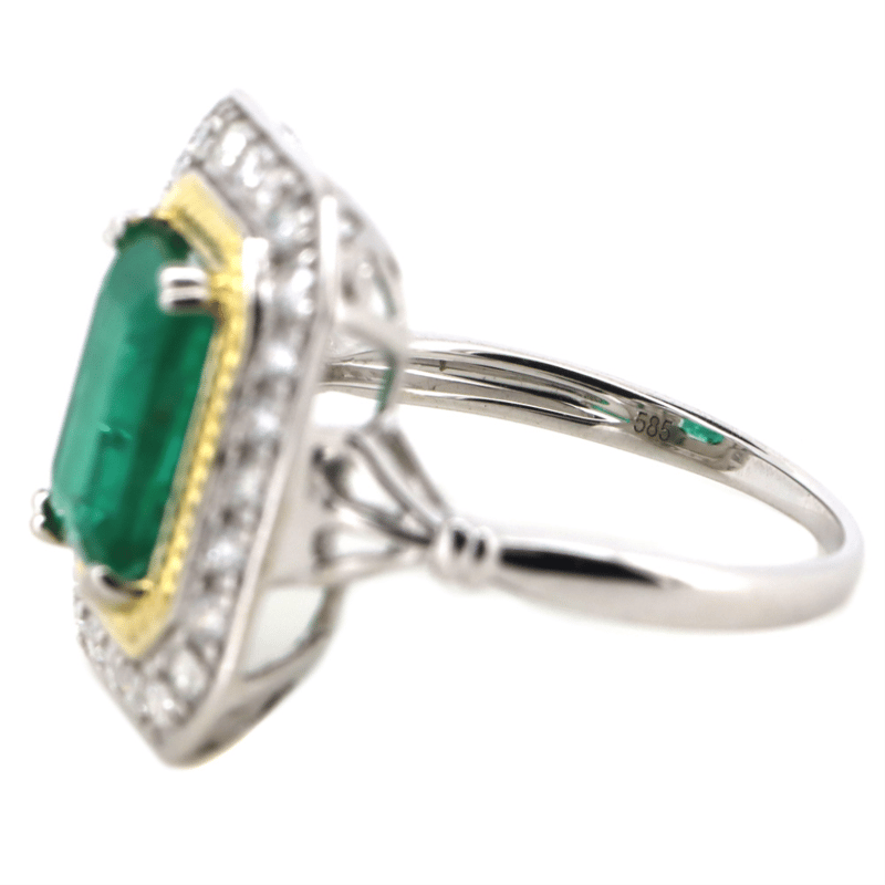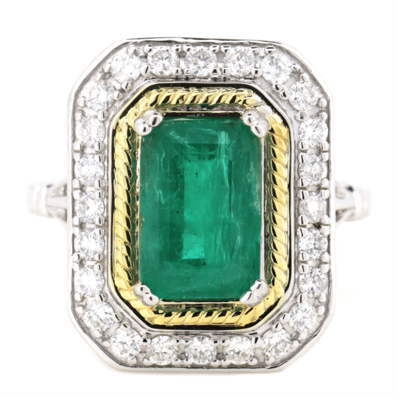 14K WHITE/YELLOW GOLD, EMERALD AND DIAMOND, HALO RING. THE CENTRE FEATURES, ONE EMERALD CUT, STRONG DEEP GREEN, EMERALD (3.13CT, MODERATE NATURALLY INCLUDED), DOUBLE CLAW SET IN YELLOW GOLD, WITH MILLEGRAIN DETAIL. SURROUNDING THE CENTRE IN A HALO ARE, 24 ROUND BRILLIANT CUT, DIAMONDS (0.60CT TDW, H-J COLOUR, SI-11 CLARITY), BEAD SET. RING SIZE P 1/2 . Valuations Provided by an Independent Third-Party Professional Not Directly Associated With Lloyds Auctions at AUD $22900This valuation has been conducted by an independent third-party professional. The valuation amount is an assessment by the issuing valuer and does not reflect the auction value of the item. Any inquiries regarding the valuation should be directed to the issuing valuer (refer to contact details on the certificate), as Lloyds Auctions has no affiliation or influence over the valuation, the valuer, or the stated amount. Condition: Good - Refer Images 0645863+5035