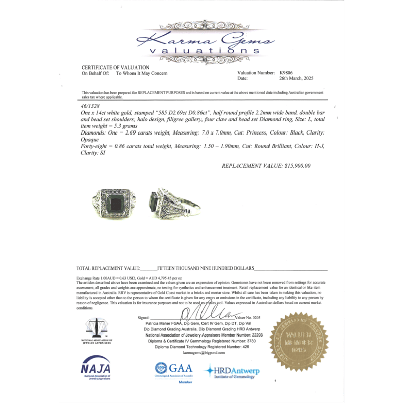 14K YELLOW GOLD, BLACK DIAMOND AND DIAMOND, DECORATIVE RING. THE CENTRE FEATURES, ONE PRINCESS CUT, BLACK, DIAMOND (2.69CT, OPAQUE), 4 CLAW SET. ENCOMPASSING THE CENTRE ARE, 48 ROUND BRILLIANT CUT, DIAMONDS (0.86CT TDW, H-J COLOUR, SI CLARITY), BEAD SET. RING SIZE L.