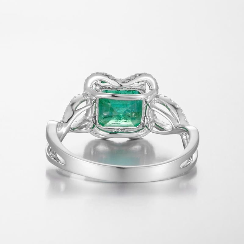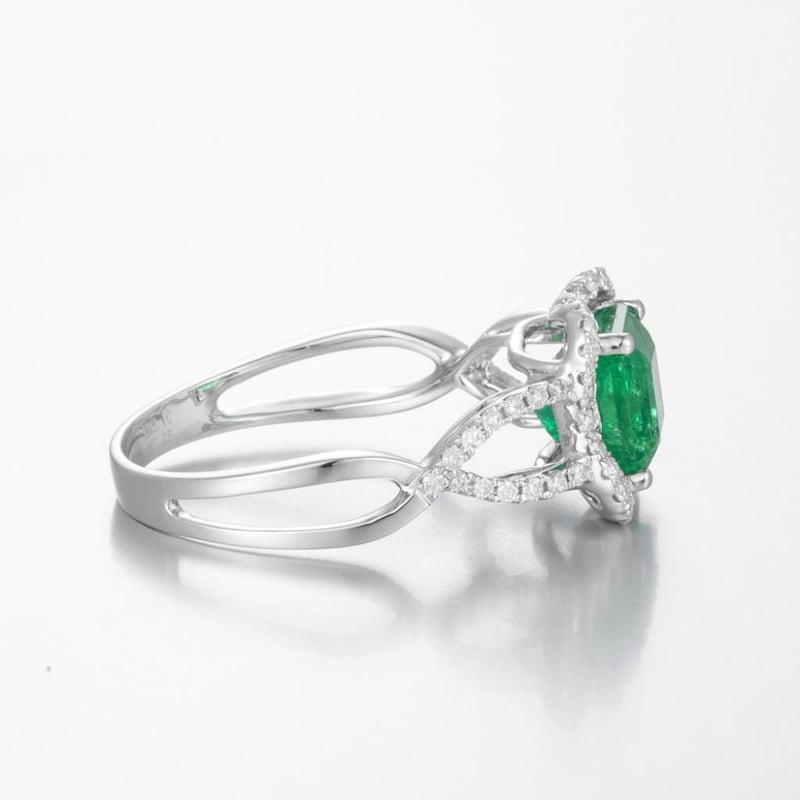 14CT WHITE GOLD ZAMBIAN EMERALD AND DIAMOND DRESS RING, FEATURING CENTRE, ONE SQUARE STEP CUT, GREEN ZAMBIAN EMERALD (2.10CT, MODERATELY INCLUDED), CLAW SET, WITH 58 ROUND BRILLIANT CUT DIAMONDS (0.25CT TDW, G-H COLOUR, VS1-VS2 CLARITY), BEAD SET. RING SIZE O.
