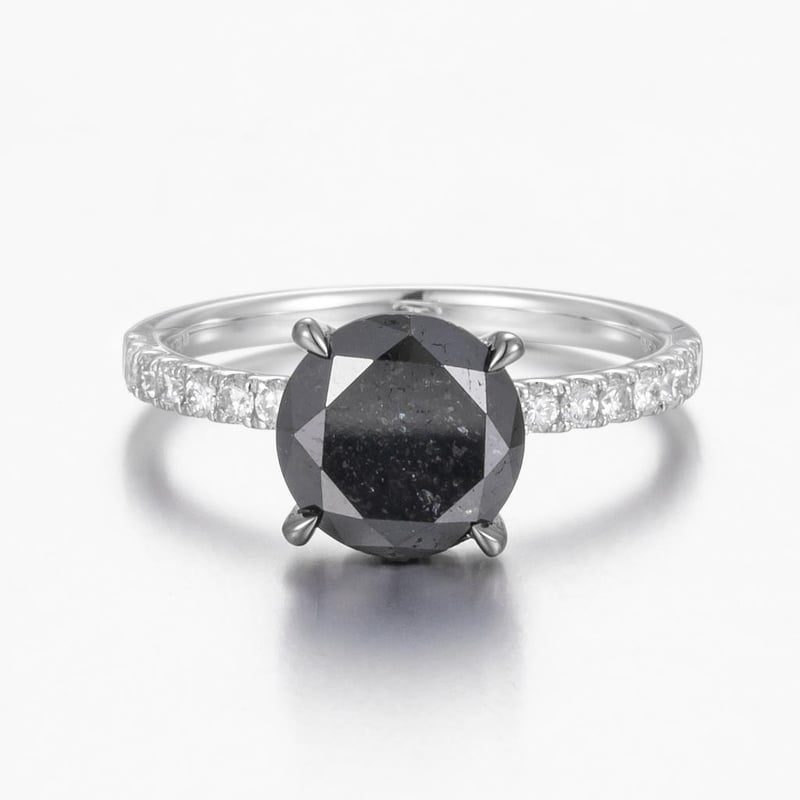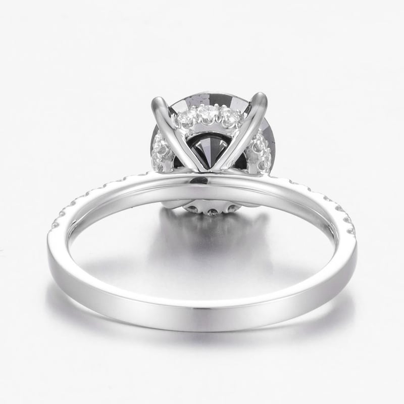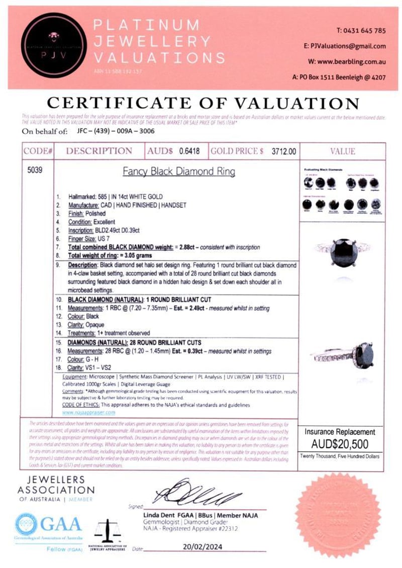 14CT WHITE GOLD BLACK DIAMOND CLASSIC RING FEATURING CENTRE, ONE ROUND BRILLIANT CUT, BLACK DIAMOND (2.49CT, OPAQUE, ENHANCED), CLAW SET, WITH 28 ROUND BRILLIANT CUT DIAMONDS (0.39CT TDW, G-H COLOUR, VS1-VS2 CLARITY), BEAD SET. RING SIZE O.