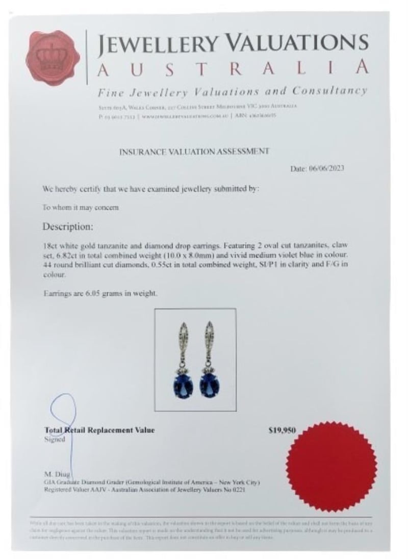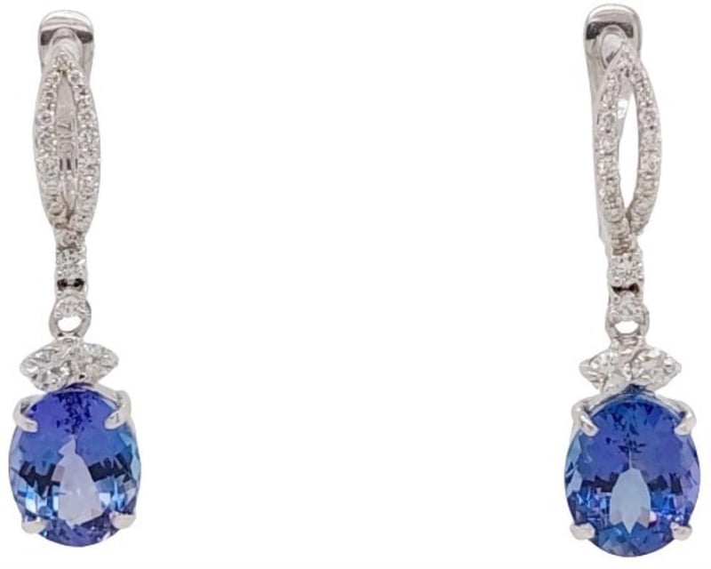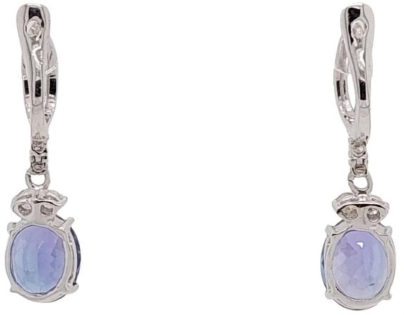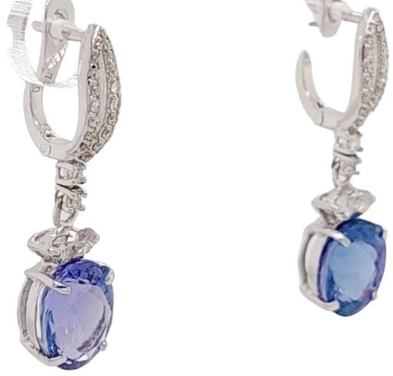 These 18Ct White Gold Tanzanite And Diamond Drop Earrings Feature 2 Oval Cut Tanzanites In Claw Set 6.82Ct Measuring: 10.0Mm X 8.0Mm And Vivid Medium Violet Blue In Colour. The Earrings Also Feature 44 Brilliant Round Cut Diamonds 0.55Ct In Total Combined Weight Si/P1 In Clarity And F/G In Colour.