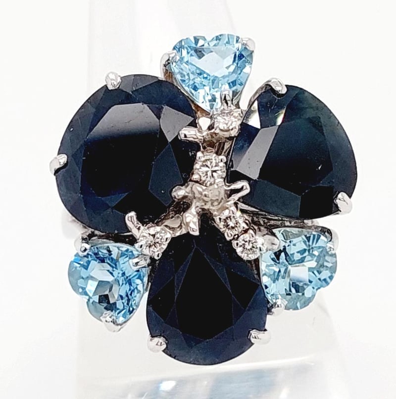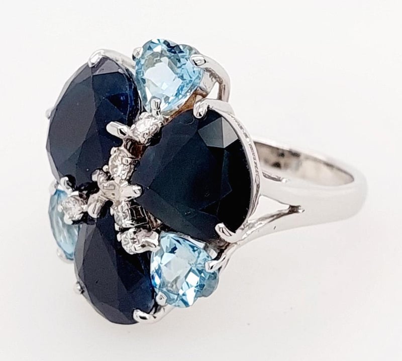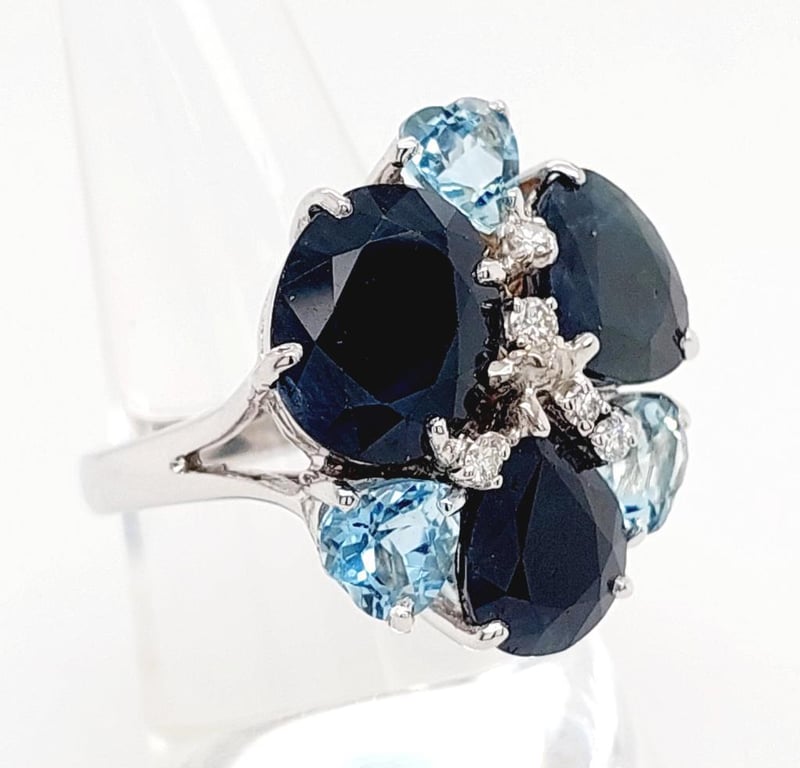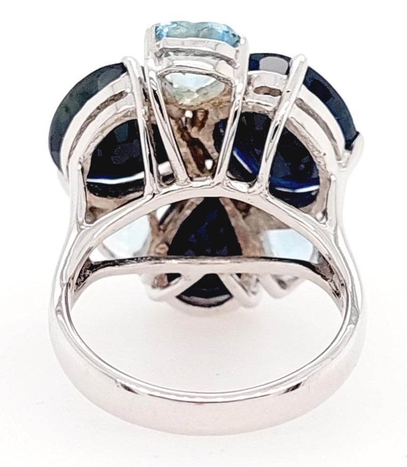 This 18Ct White Gold Ring Features 1 X Oval Cut And 2 X Pear Cut Claw Set Sapphires, 14.40Ct In Total Combined Weight And Dark Blue In Colour. This Ring Also Features 3 X Heart Cut Claw Set Aquamarines, 2.42Ct In Total Combined Weight And Blue In Colour With 5 X Brilliant Round Cut Claw Set Diamonds, 0.12Ct In Total Combine Weight, Vs/Si In Clarity And G/H In Colour.