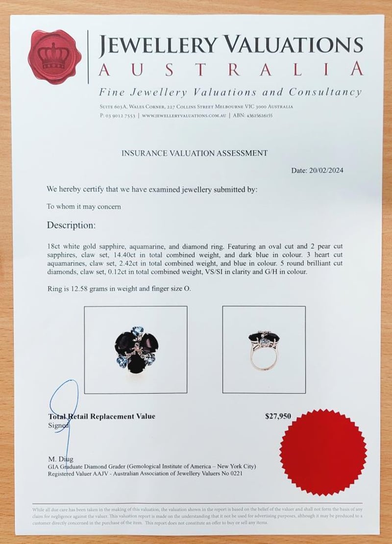 This Insurance Valuation has been provided by a registered Jewellery Valuer and is intended for insurance purposes only. The valuation amount has no bearing on the auction value of the item. Any questions regarding the valuation should be directed to the issuing Valuer (refer to contact details on the certificate) as Lloyds have no association or relationship with the Valuer or the valuation amount contained within the valuation.