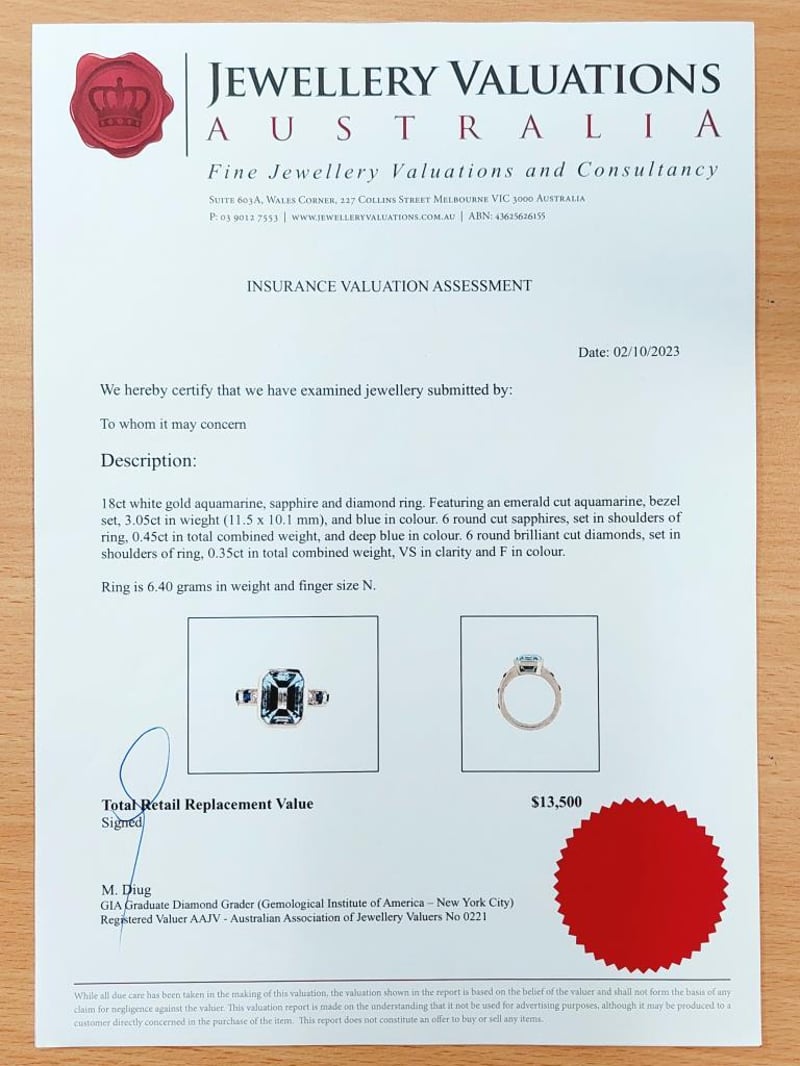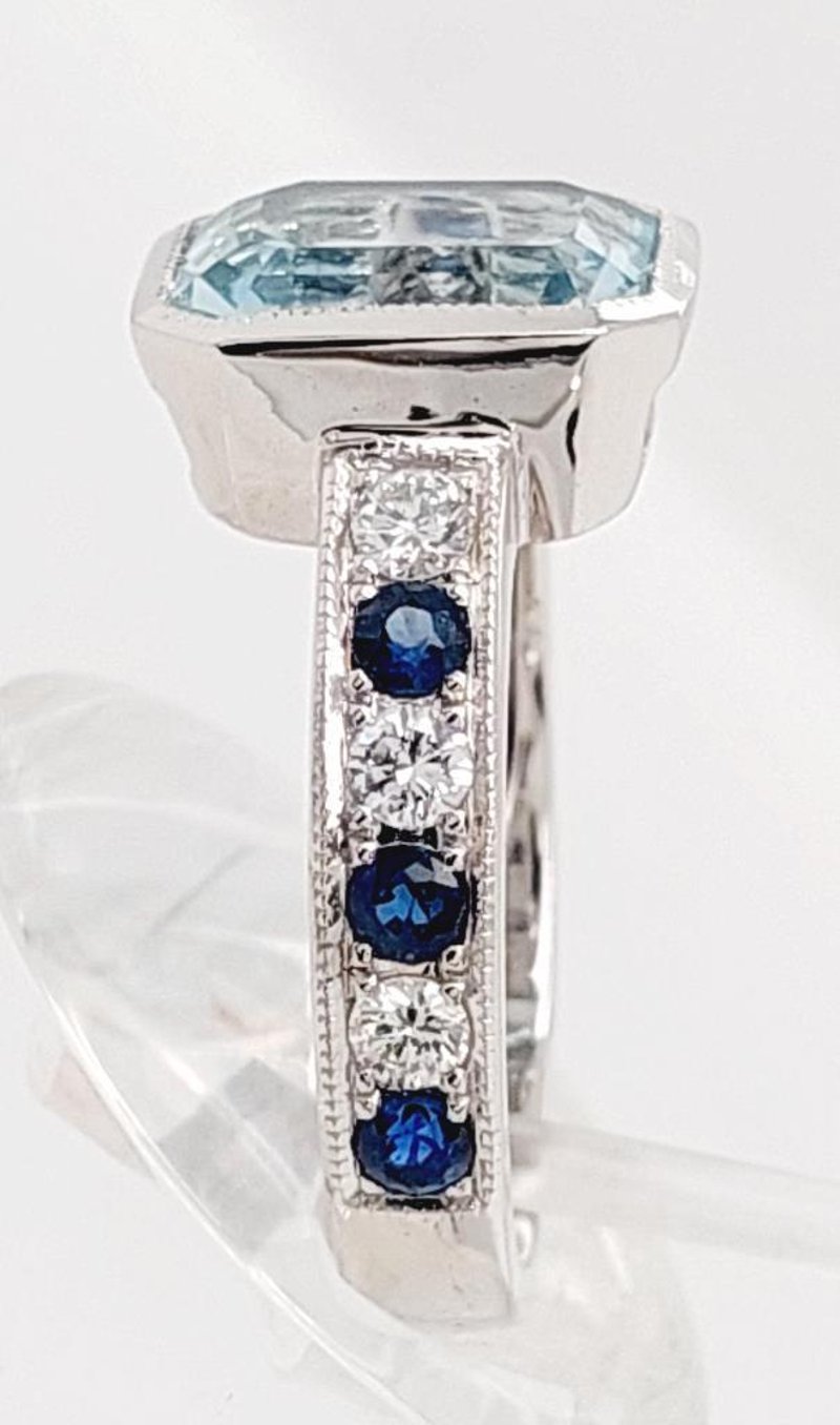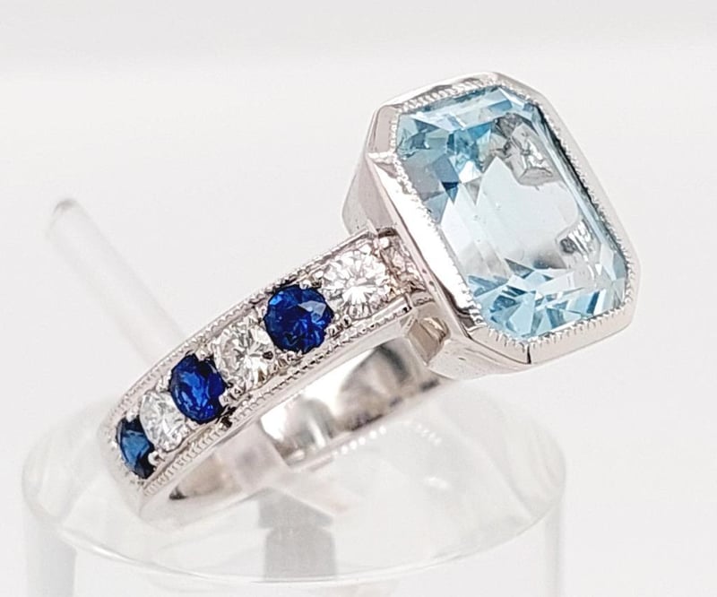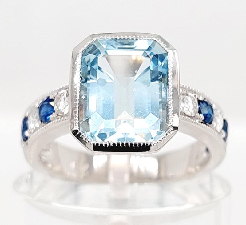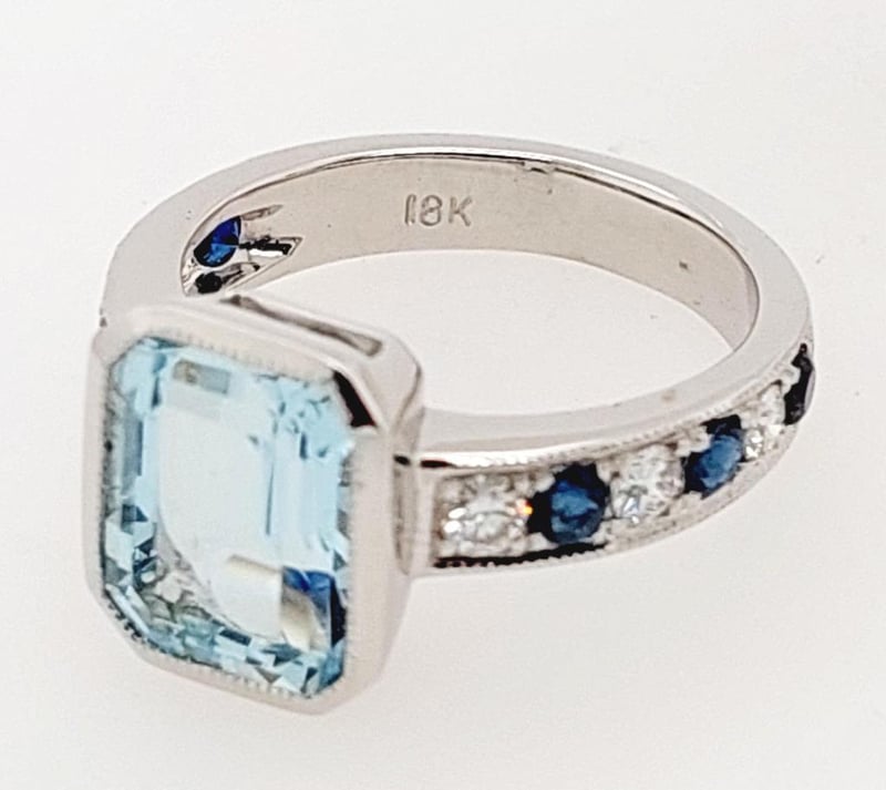 This 18Ct White Gold Ring Features One 3.05Ct Emerald Cut Bezel Set Aquamarine, Measures 11.5Mm X 10.1Mm And Is Blue In Colour. This Ring Also Features 6 Round Cut Sapphires Set In The Shoulders Of Ring, 0.45Ct In Total Combined Weight And Deep Blue In Colour With 6 Brilliant Round Cut Diamonds Set In Shoulders Of Ring, 0.35Ct In Total Combined Weight, Vs In Clarity And F In Colour.