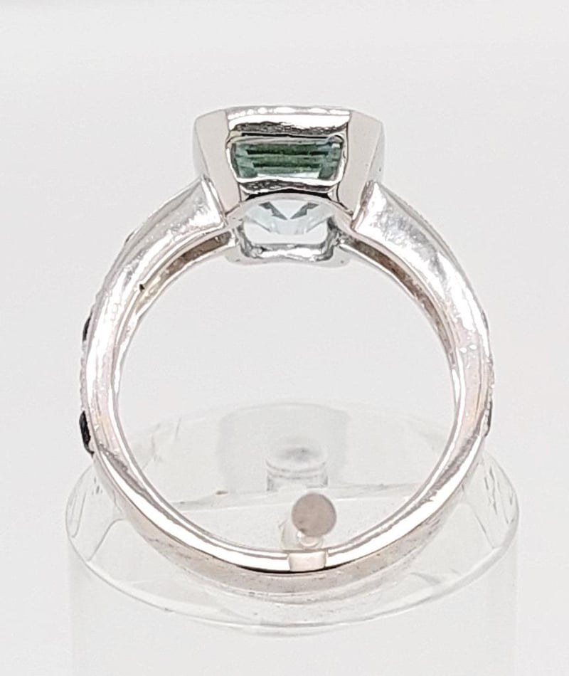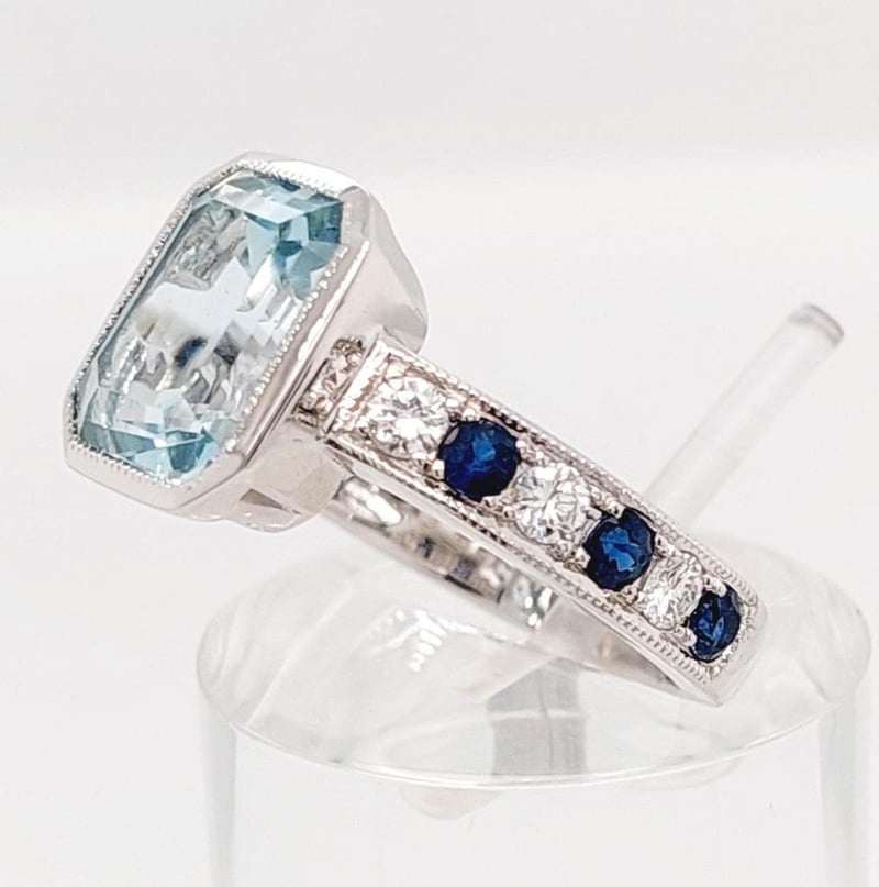 18CT WHITE GOLD AQUAMARINE, SAPPHIRE AND DIAMOND RING