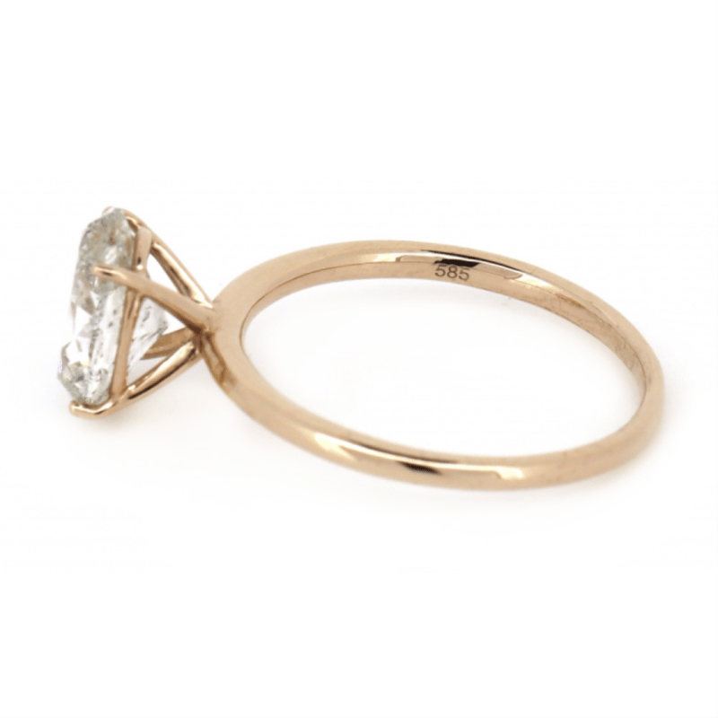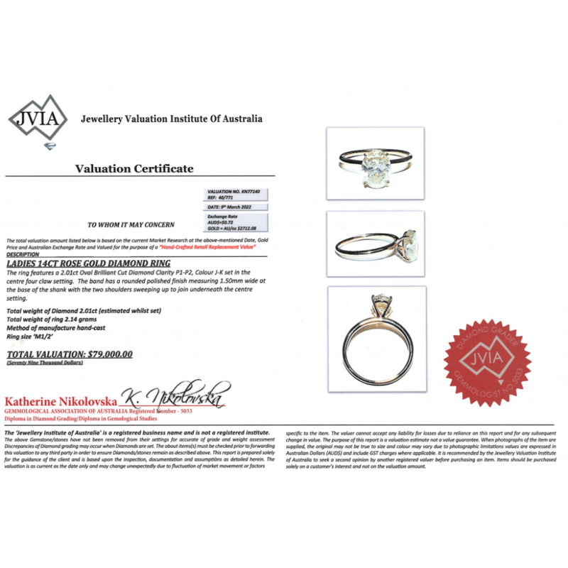 14K ROSE GOLD AND 2.01CT DIAMOND, SOLITAIRE RING. THE CENTRE FEATURES, ONE OVAL BRILLIANT CUT, DIAMOND (2.01CT, J-K COLOUR, P1-P2 CLARITY), 4 CLAW SET. RING SIZE M 1/2. CONDITION: NEW.