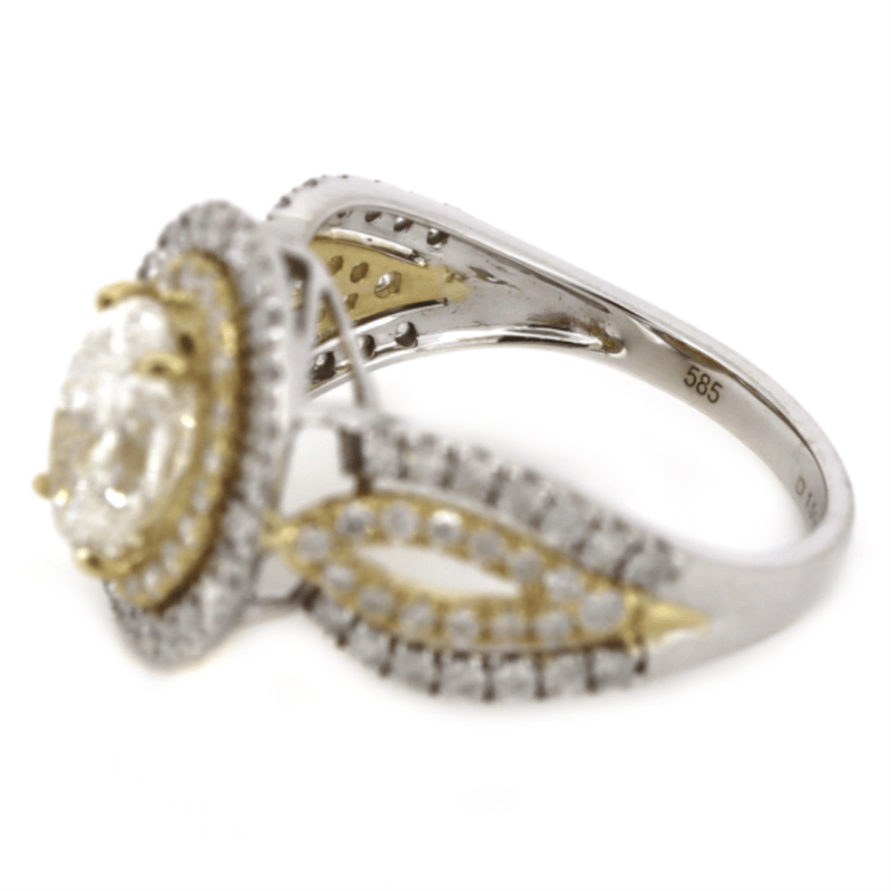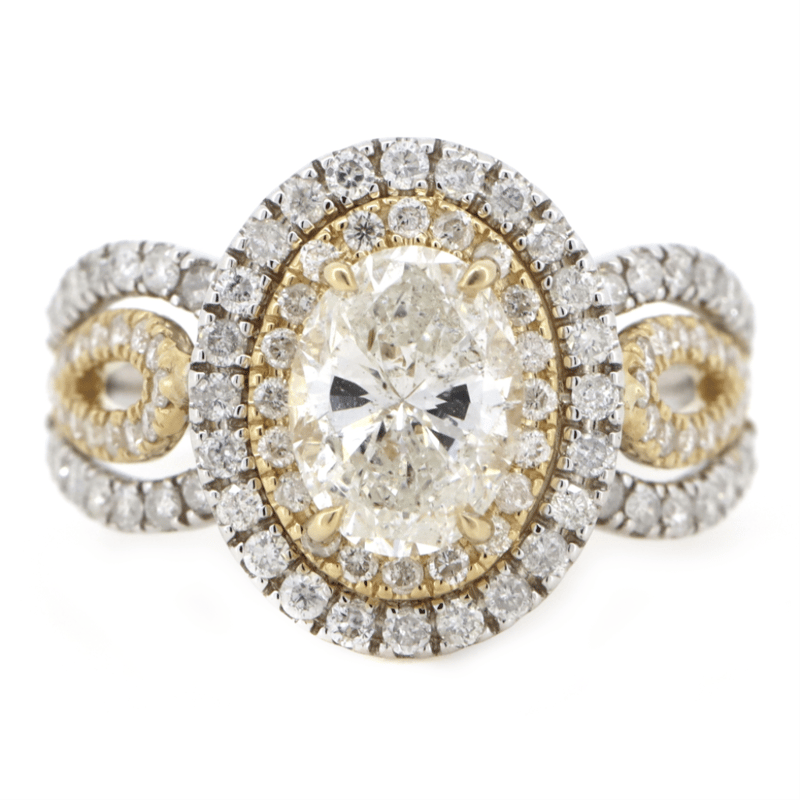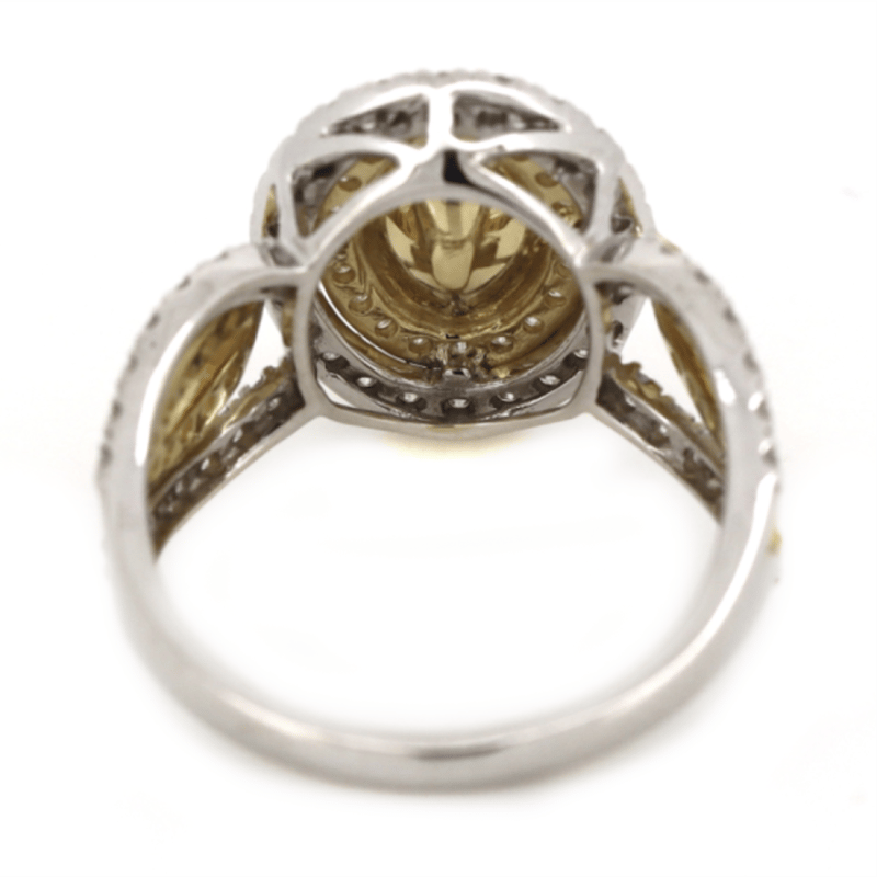 14K YELLOW/WHITE GOLD AND DIAMOND, DOUBLE HALO SPLIT BAND RING. THE CENTRE FEATURES, ONE OVAL CUT, LIGHT FANCY YELLOW, DIAMOND (1.51CT, P1 CLARITY), 4 CLAW SET. SURROUNDED BY, 100 ROUND BRILLIANT CUT, DIAMONDS (0.84CT TDW, H-K COLOUR, P2+ CLARITY), BEAD SET IN YELLOW AND WHITE GOLD. RING SIZE M.