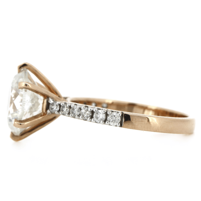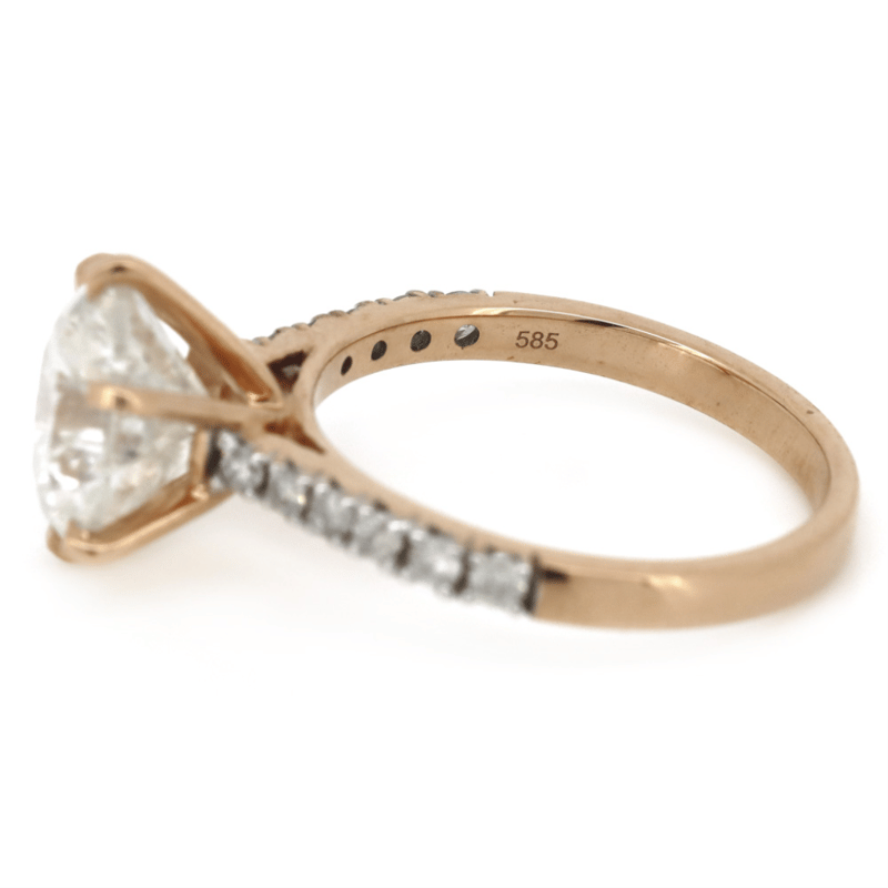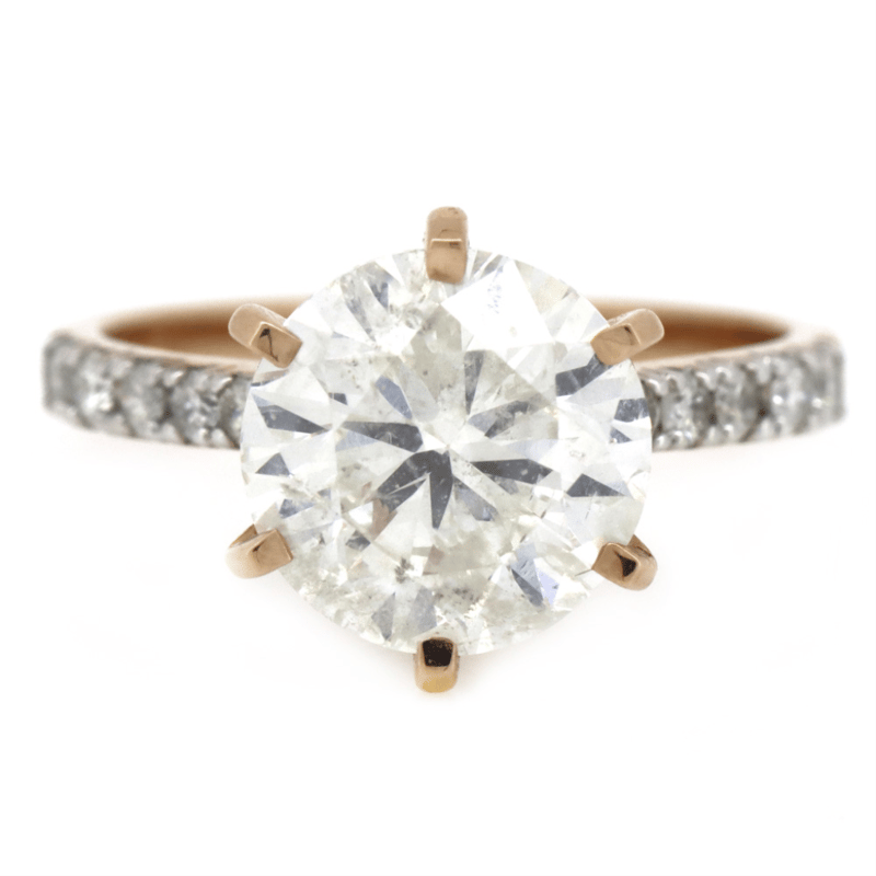 14K ROSE GOLD AND DIAMOND, CLASSIC RING. THE CENTRE FEATURES, ONE ROUND BRILLIANT CUT, DIAMOND (3.25CT, I-J COLOUR, P1 CLARITY), 6 CLAW SET. DECORATING THE BAND ARE, 12 ROUND BRILLIANT CUT, DIAMONDS (0.26CT TDW, H-I COLOUR, P1+ CLARITY), CLAW SET. RING SIZE L.