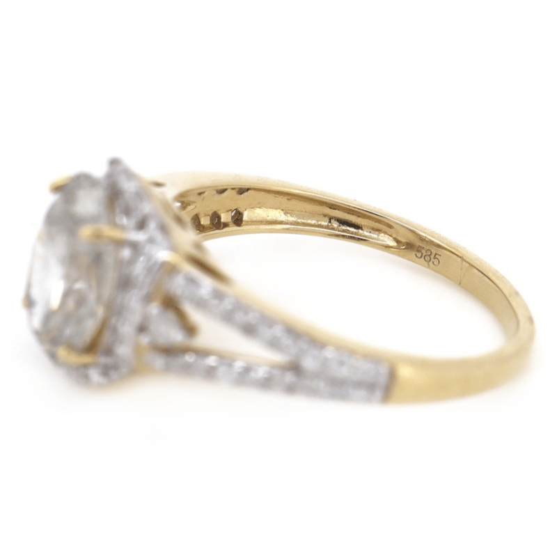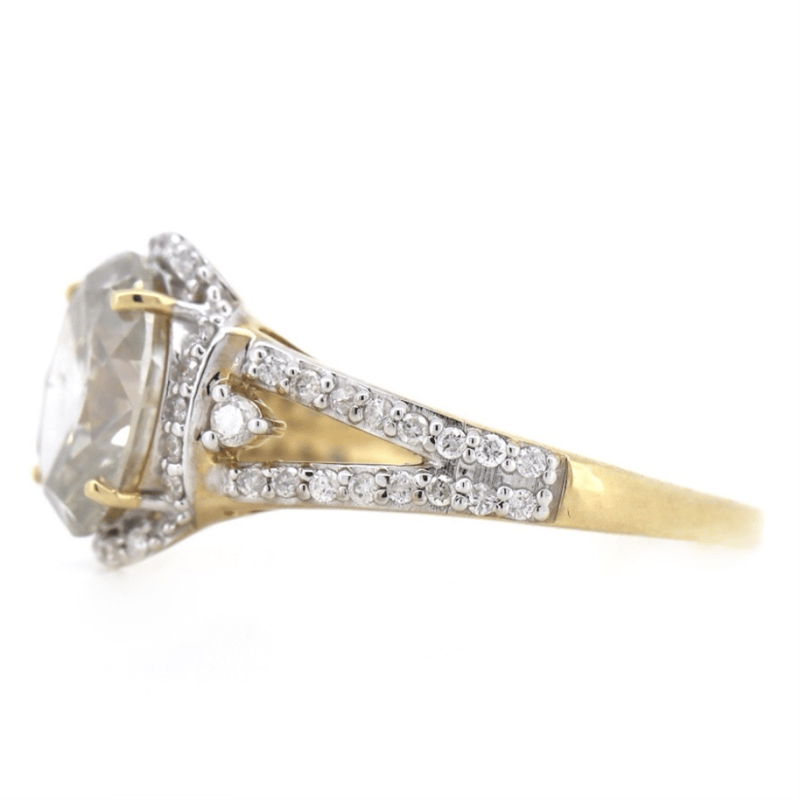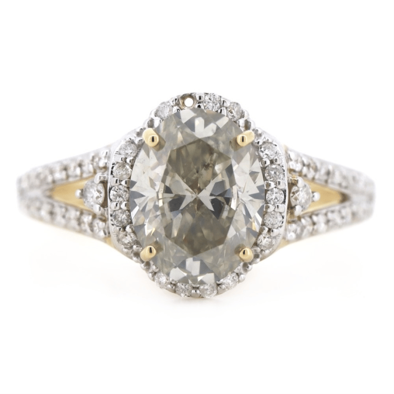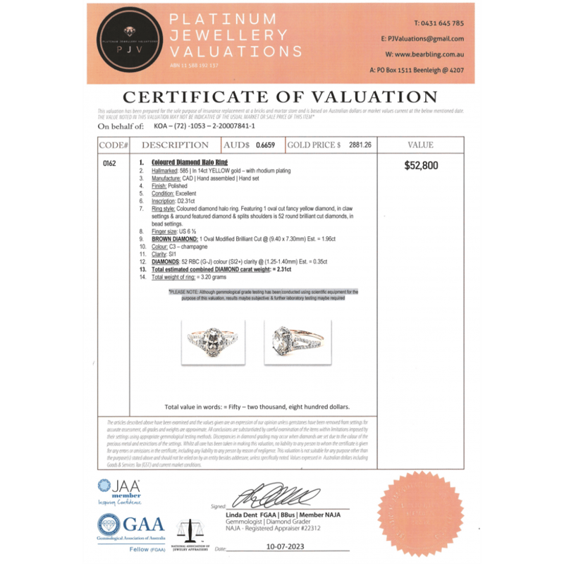 14K YELLOW GOLD, CHAMPAGNE DIAMOND, HALO RING. THE CENTRE FEATURES, ONE OVAL MODIFIED BRILLIANT CUT, CHAMPAGNE, DIAMOND (1.96CT, C3 COLOUR, SI1 CLARITY), 4 CLAW SET. SURROUNDING THE CENTRE IN A HALO AND DECORATING THE BAND ARE, 52 ROUND BRILLIANT CUT, DIAMONDS (0.35CT TDW, G-J COLOUR, SI2+ CLARITY), CLAW SET. RING SIZE M 1/2.
