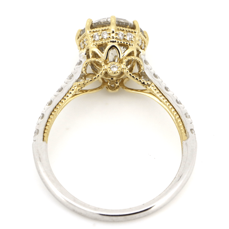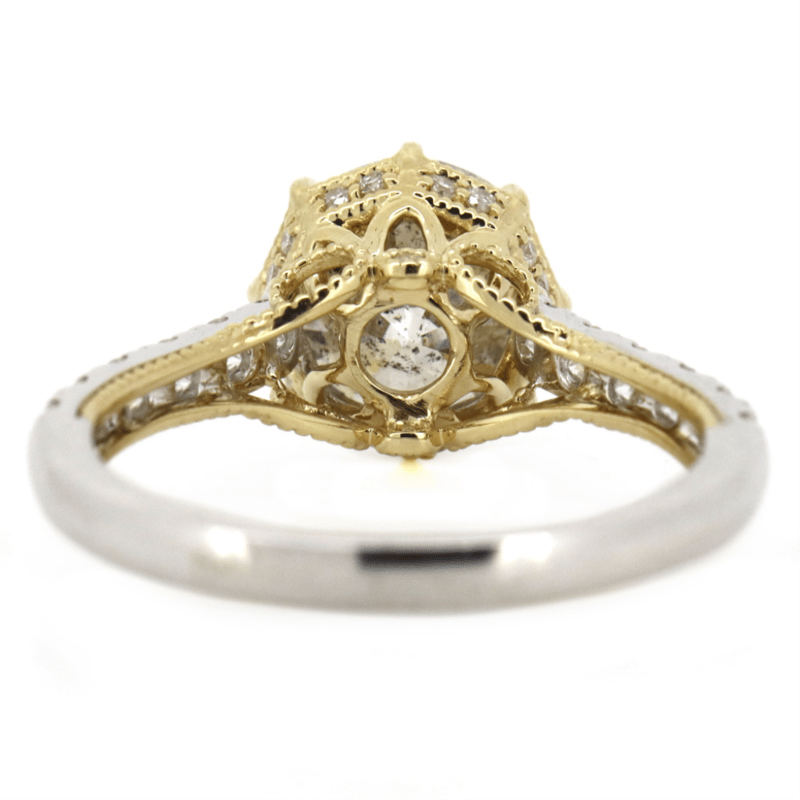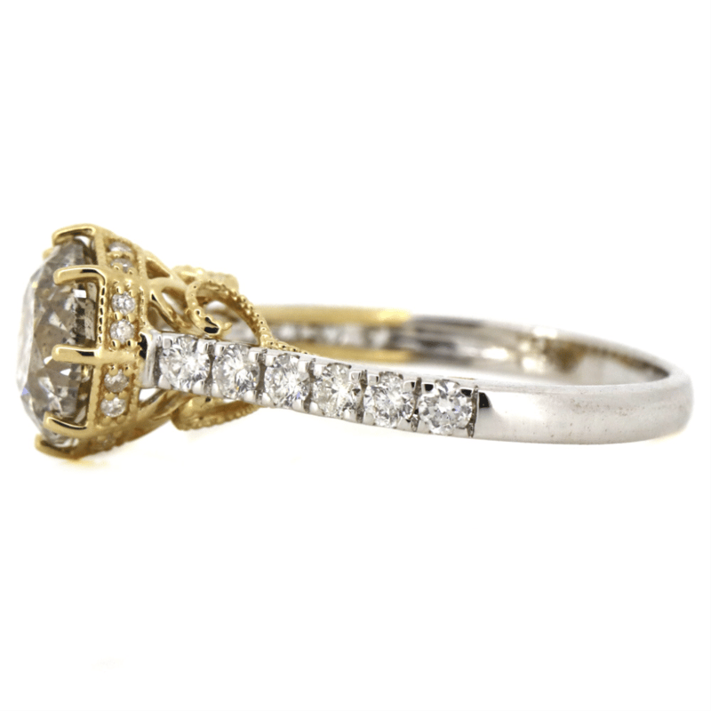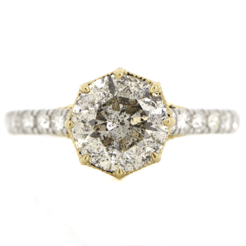 14K WHITE/YELLOW GOLD AND DIAMOND, DRESS RING. THE CENTRE FEATURES, ONE ROUND BRILLIANT CUT, DIAMOND (2.36CT TDW, K-L COLOUR, SALT & PEPPER CLARITY), MULTI-CLAW SET. DECORATING THE SETTING AND THE BAND ARE, 30 ROUND BRILLIANT CUT, DIAMONDS (0.52CT TDW, G-H COLOUR, SI1-SI2 CLARITY), PIP-CLAW SET. RING SIZE M 1/2.